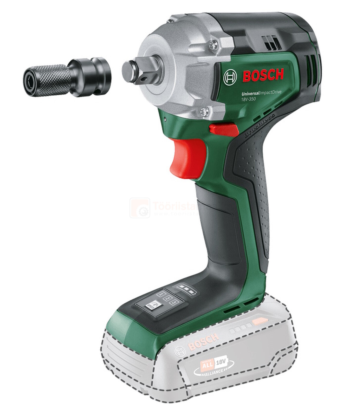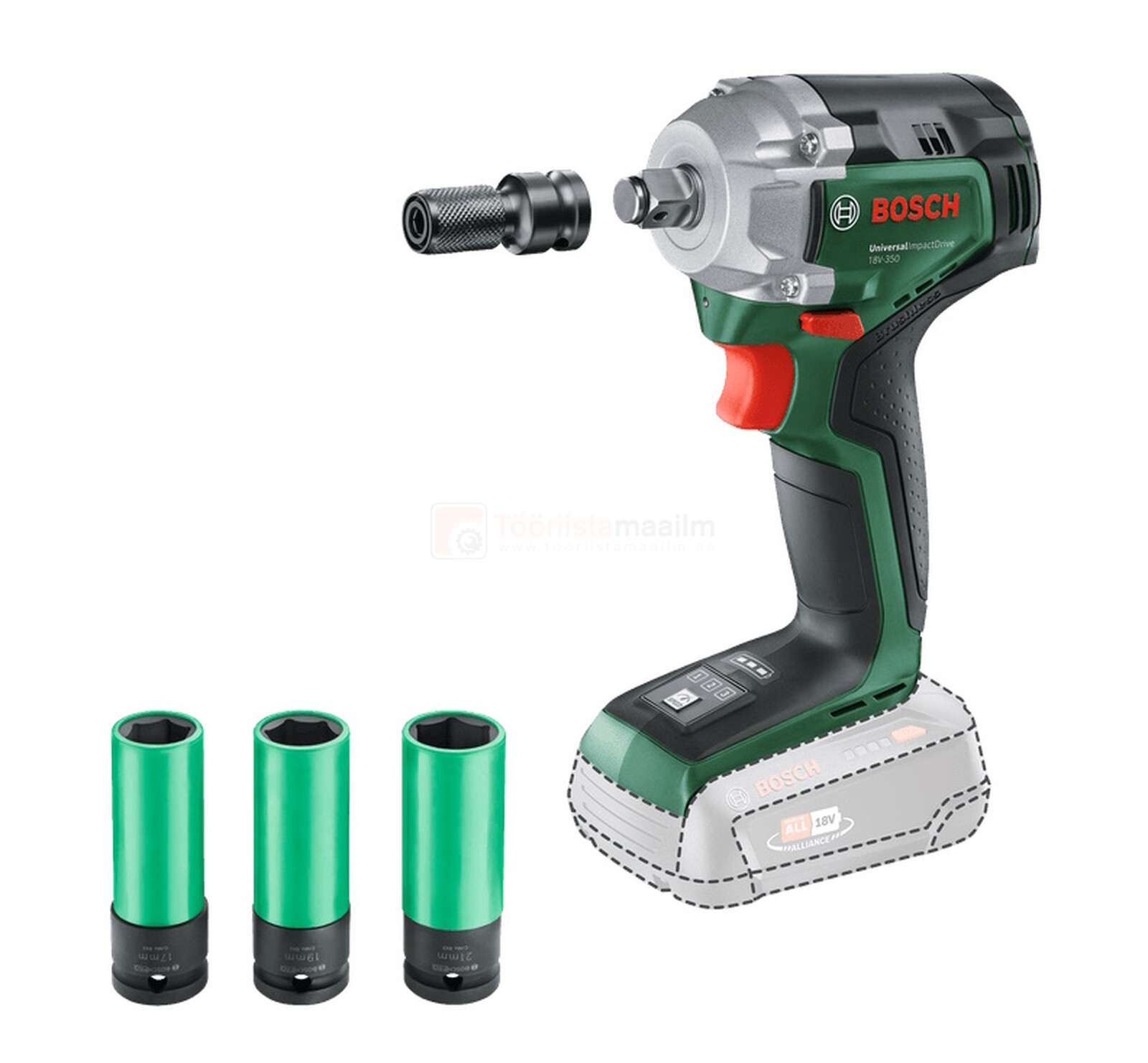 Bosch akulöökmutrikeeraja UniversalImpactDrive 18V-350 + 3 löökpadrunit - ilma aku ja laadijata Tootekood: 0603980305PTG GTIN: 4053423319958 Akumutrikeerajad | 112,20 € | Poodi | ||