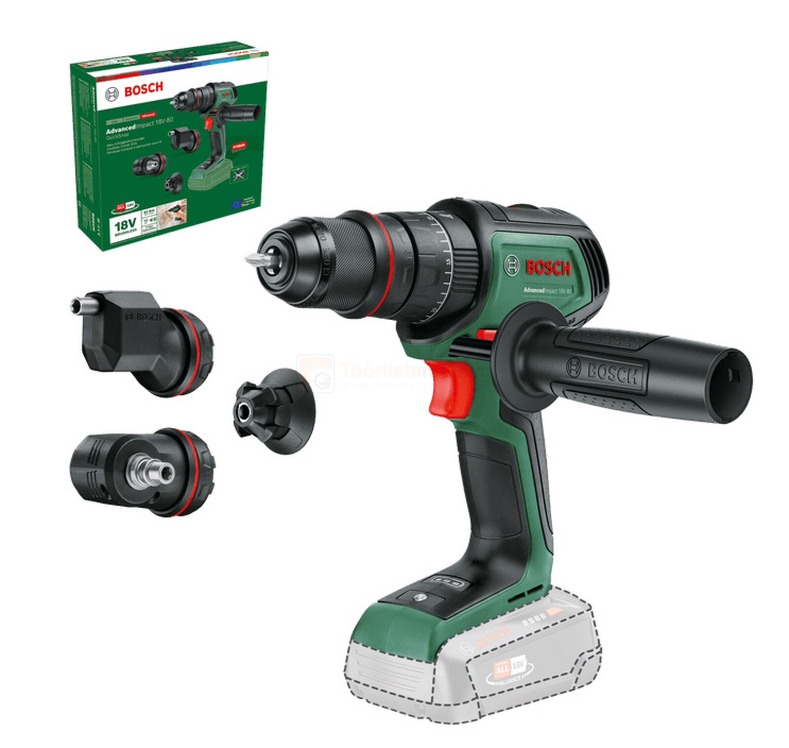 Bosch akulööktrell AdvancedImpact 18V-80 QuickSnap + 2 lisaadapterit - ilma aku ja laadijata Tootekood: 06039E2103PTG GTIN: 4053423239850 Akutrellid | 112,20 € | Poodi | ||