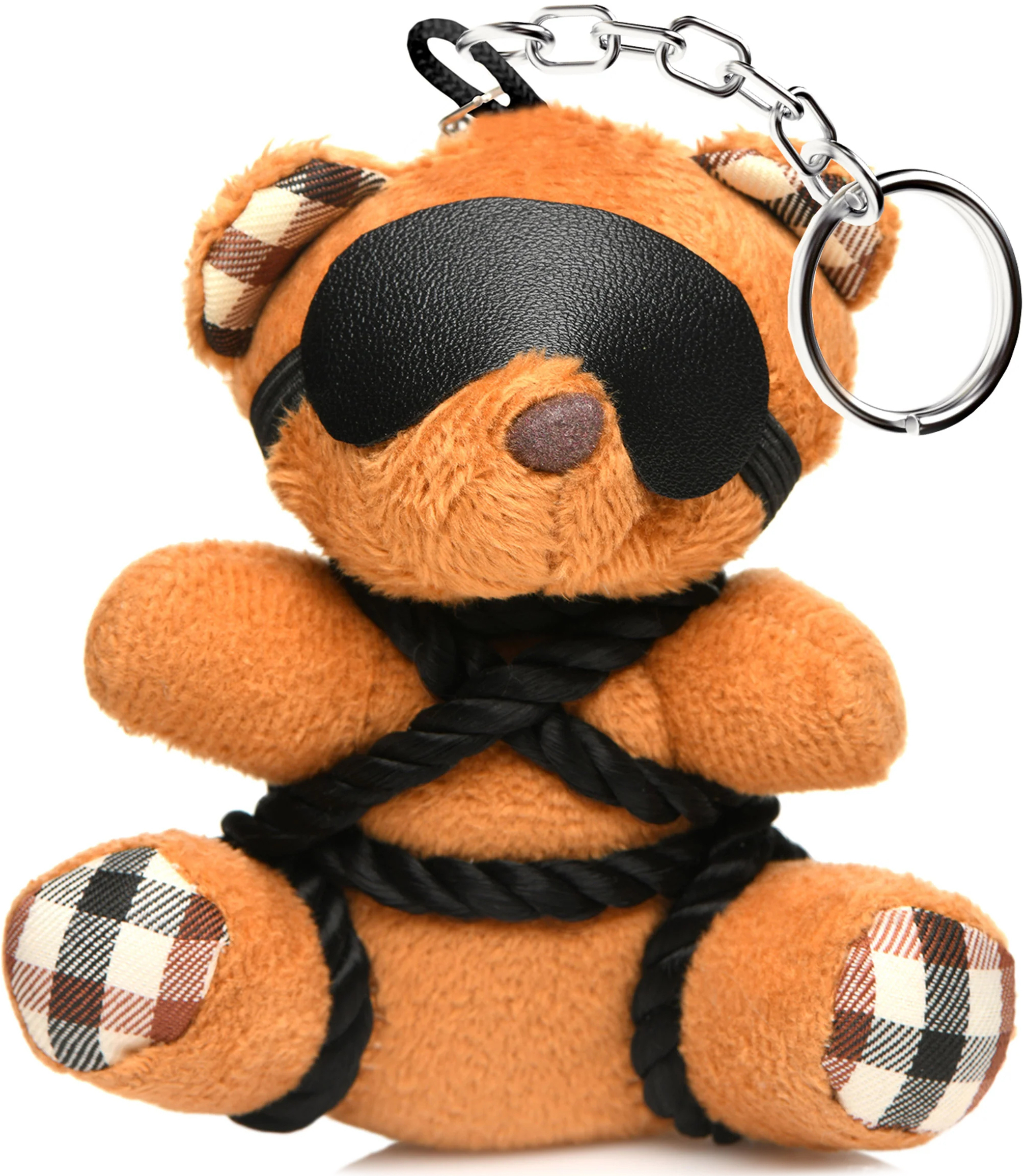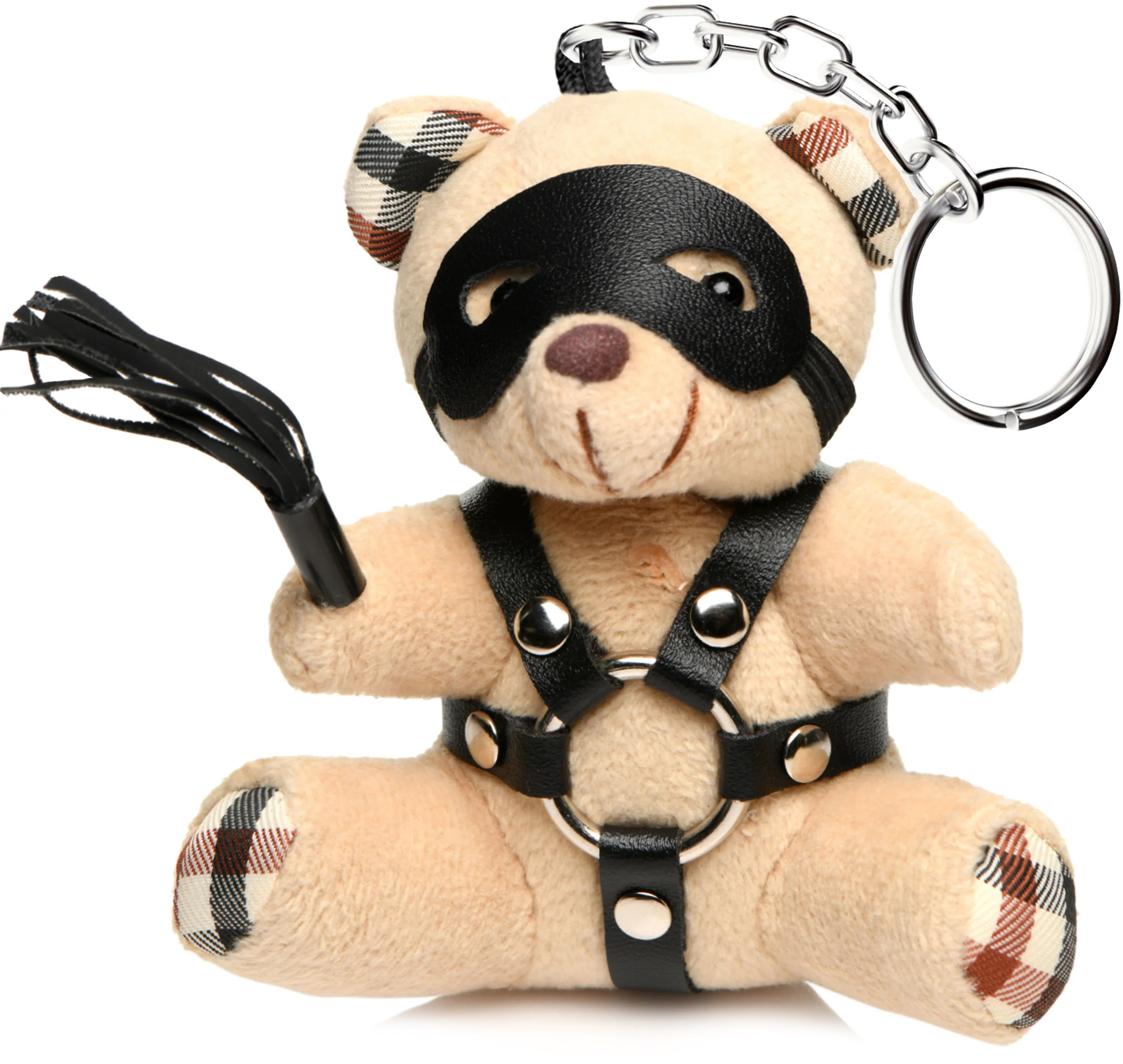 Võtmehoidja, millel on kunstnahast rakmete ja eemaldatava maskiga riietatud kaisukaru, millel on mini piitsutaja. - Teddy karu mõõtmed: 10 x 9 x 6 cm - ahela pikkus: 6 cm - rõnga läbimõõt: 2,5 cm - materjal: polüester, polüuretaan, ABS plastik, niklivaba metall