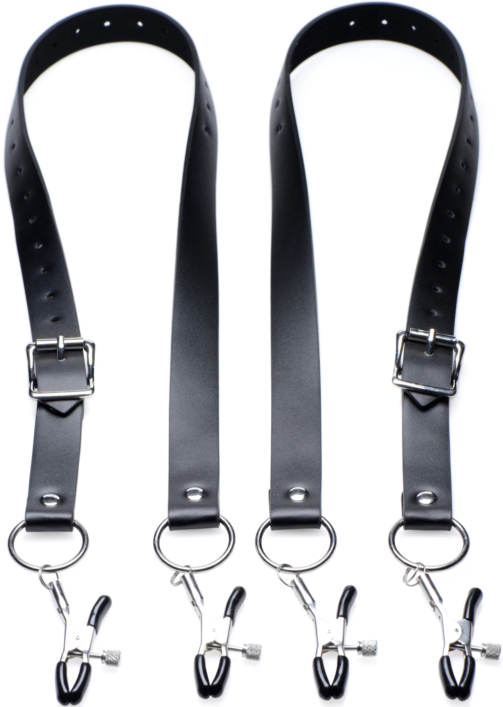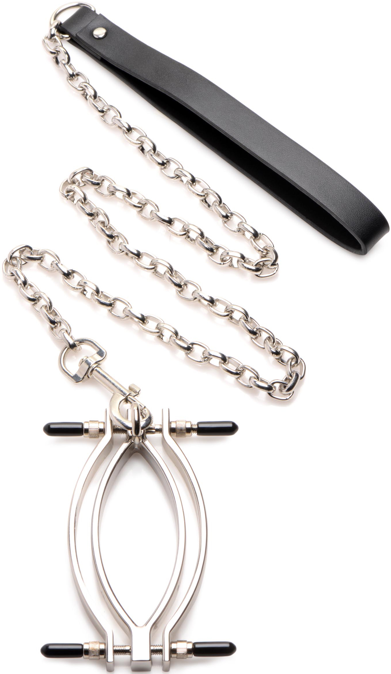 Labia laiendaja klambritega, mis on ühendatud kunstnahast rihmadega. Rihmad mähivad ümber reite; pikkus on reguleeritav luku abil. Klambritel on mustad kummist otsad. - klipi pikkus: 6 cm - pikim rihma pikkus koos klambritega: 80 cm - rihma laius: 2 cm - materjal: raud (niklivaba), polüuretaan, PVC