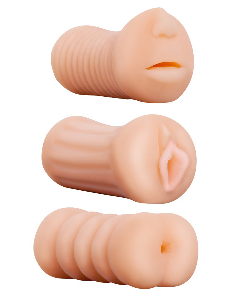 Siin on midagi kõigile! Mitmekesisus lisab elule vürtsi! Kas soovite osta uue masturbaatori, kuid ei tea, milline ava on parim? Siis sobib see komplekt just teile, sest sellesse kuulub kolm masturbaatorit kolme erineva avaga. Te naudite kolme avaust, mis on vagiina, anuse ja suu realistlikud koopiad – teie otsutate, millist te soovite kasutada. Kõik kolm masturbaatorit tunduvad nahal sametiselt pehmed ja nende sisemus onstimuleeriva struktuuriga – olenevalt mudelist on tekstuur põnevate soonte või erutavate täppidega. See komplekt pakub tõesti midagi igaühele - mida te veel ootate? Täielik pikkus ligikaudu 10 cm, Ø väga paindlik. Materjal: TPE, ftalaadivaba vastavalt ELi määrusele REACH.