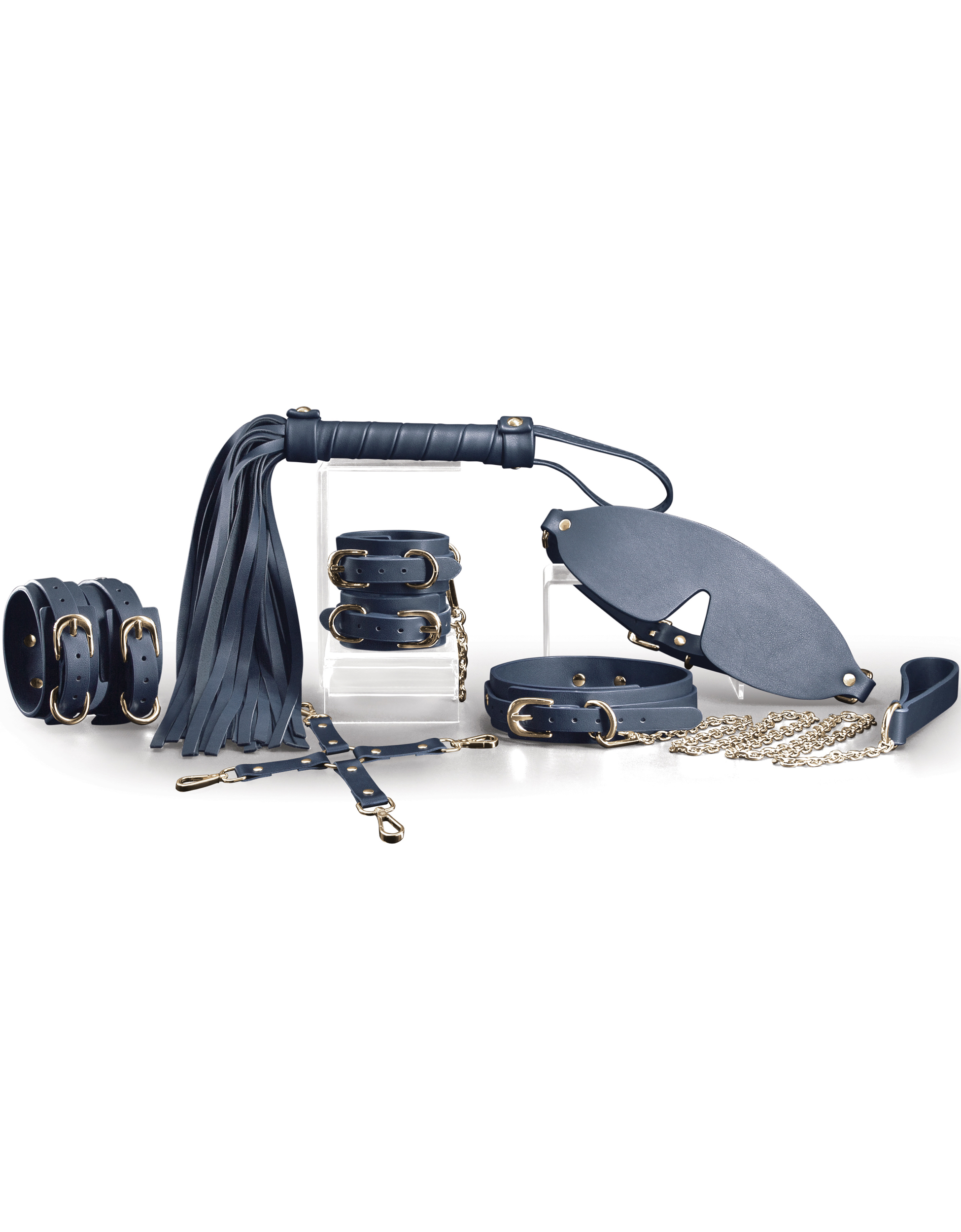 Bondage Couture äratab teie BDSM rollimängufantaasiad ellu 6-komplektiga, mis koosneb kvaliteetsetest ohjeldustest ja tarvikutest, mis on kuningliku sinise värvi ja kuldsete metallist detailidega, sealhulgas: - silmakinnitus - 21 x 7,5 cm; - piitsa - täispikkusega 50 cm; - kaelarihm - laius 3 cm, ümbermõõt kuni 44 cm, koos 115 cm pikkuse rihmaga; - randmepaelad; - randmepaelad; - kinnitusrihma koos haakekonksudega. Materjal: polüuretaan, metall (niklivaba).