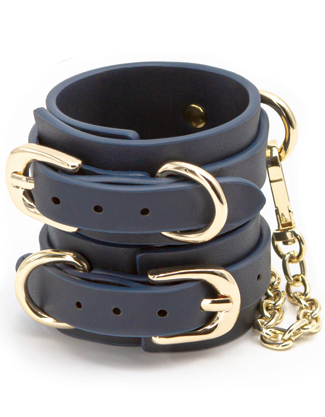 Mereväesinised kunstnahast randmepaelad kuldsete lukkude ja ketiga, mis on osa peenest Bondage Couture'i kollektsioonist. Lukkude kinnitused on reguleeritavad. - ümbermõõt: kuni 22 cm - laius: 3,2 cm - ahela pikkus: 18 cm - materjal: polüuretaan, niklivaba metall