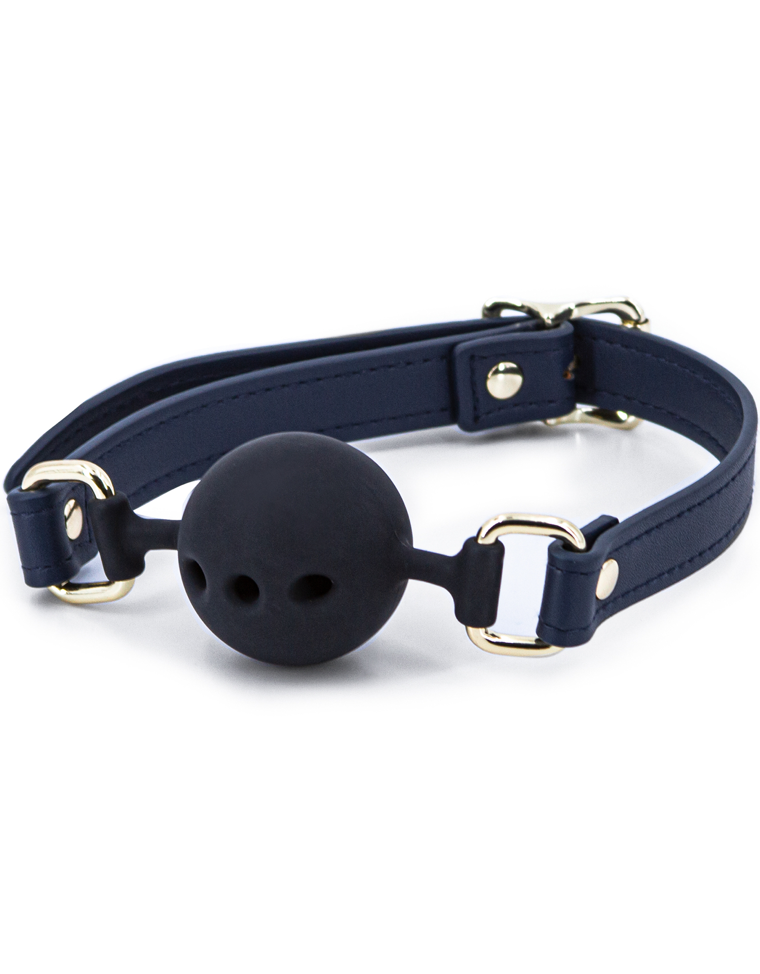 Tumesinine silikoonist suutropp kolme hingamist lihtsustava auguga ja reguleeritavate kunstnahast rihmadega, millel on kuldsed needid ja pandlad. See tropp on osa suurepärasest Bondage Couture-kollektsioonist. • tropi läbimõõt: 4,5 cm • ümbermõõt: kuni 50 cm • materjal: silikoon, polüuretaan, niklivaba metall