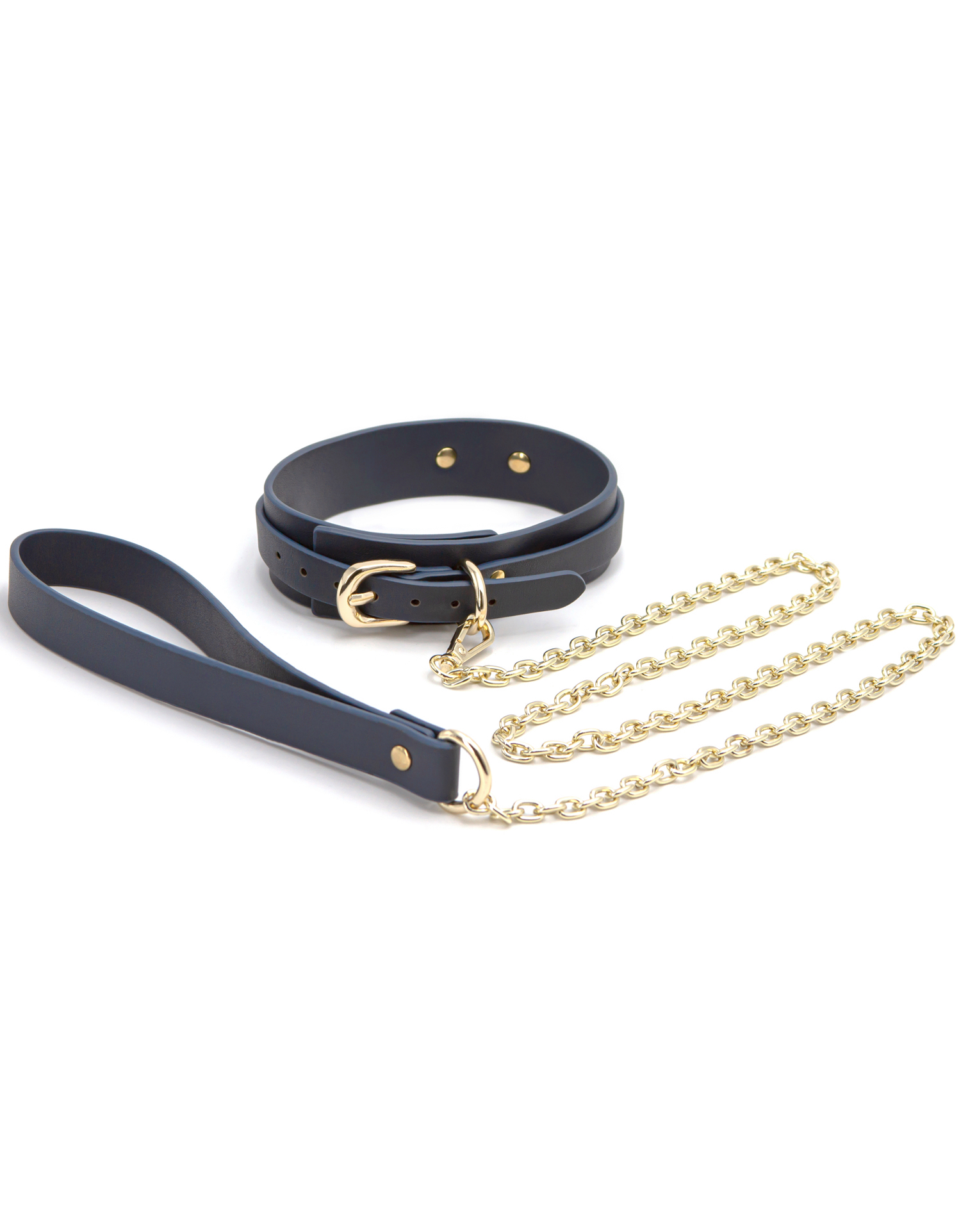 Mereväesinine kunstnahast kaelarihm koos kuldse ketiga - osa peenest Bondage Couture kollektsioonist. Lukkukinnitus on reguleeritav. - Kaela ümbermõõt: kuni 44 cm - krae laius: 3 cm - ahela pikkus koos aasaga: 115 cm - materjal: polüuretaan, niklivaba metall