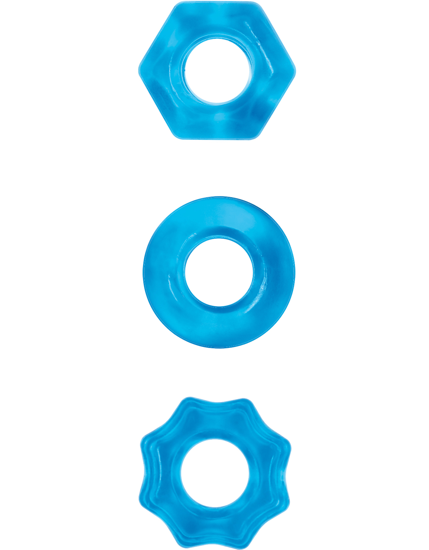 Kolme veniva peenise- ja munandirõnga komplekt. Kasutage ainult veepõhiseid libesteid, kuna need ei kahjusta pehmet geeljat materjali. Puhastage soojas vees õrnatoimelise seebiga või kasutage seksmänguasjade puhastusvahendit. • läbimõõt: elastne, min 1,7 cm • paksus: 2 cm • materjal: TPE