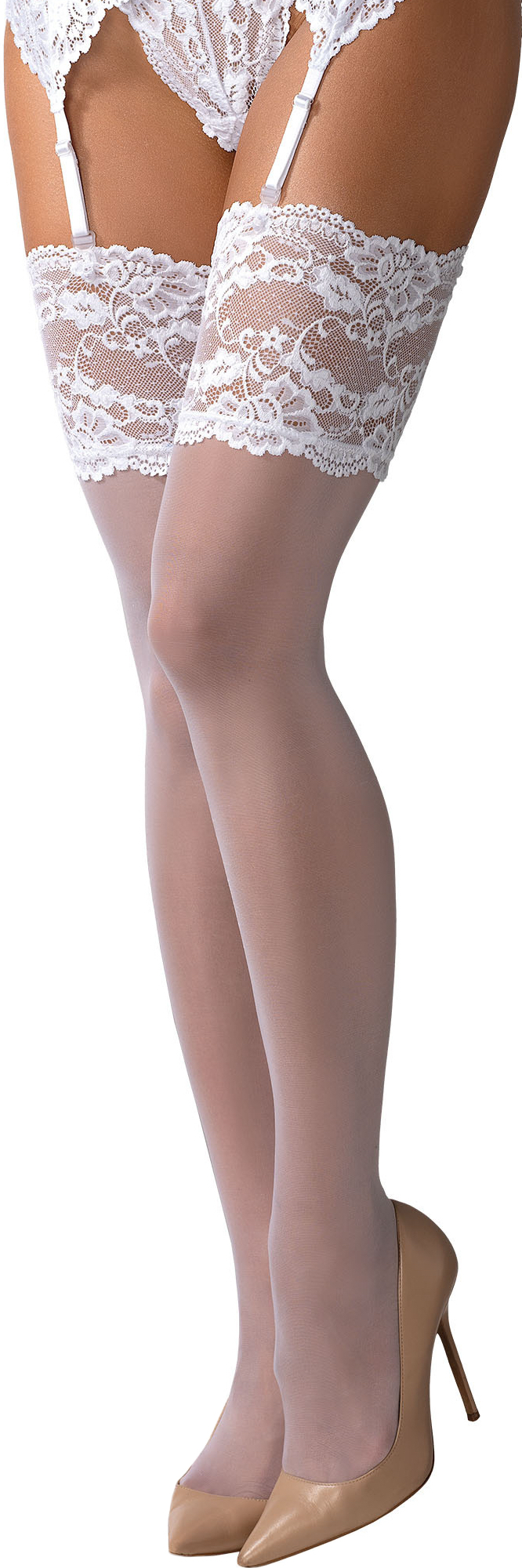Valged läbipaistvad sukad, millel on lai pitsiline ääristus. Ilma sukapaelarihmata. Reie ümbermõõt: S/M 50-55 cm L/XL 55-60 cm Kangas: 90% nailon, 10% elastaan. Pesu käsitsi, maksimaalne temperatuur 30 °C.