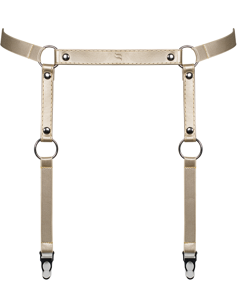 Must, nahk imitatsioon, sukapaelarihm. Vöö rihmad on ühendatud stiilsete, hõbedaste rõngastega. Reguleeritav elastne rihm ees ja reguleeritav sulgemine taga. Stringid ja sukad ei kuulu komplekti. Materjalid: 60% polüuretaan, 40% metall.