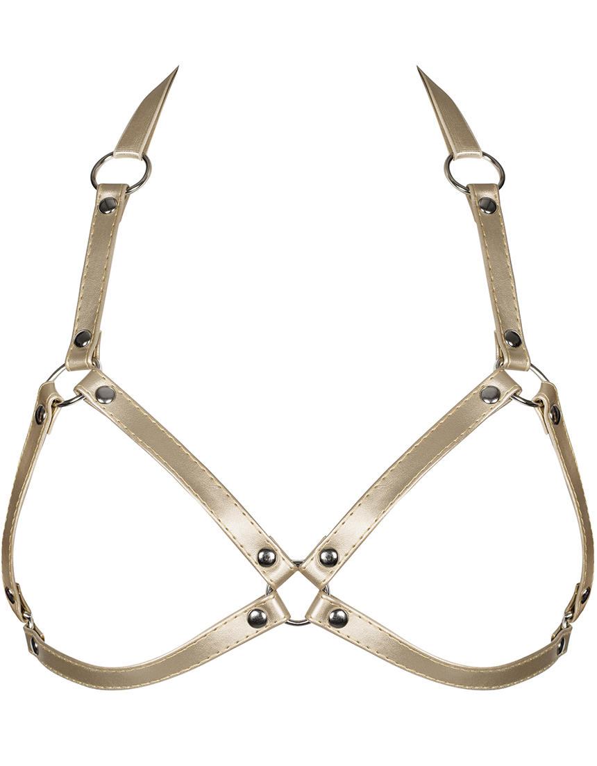 Tigedad rakmed kupiteta rinnahoidja kujul. Vööd on reguleeritavad, et need sobiksid ideaalselt. Hõbedast värvi, metallist ühendused ja metallrõngad - need ühendavad rinnahoidja rihmad ja loovad uimastava efekti. Materjalid: 60% polüuretaanist, 40% metallist. Nibukatted ei kuulu komplekti.