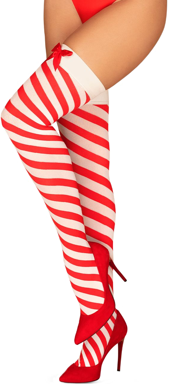 Tõsta oma pidulikku riietust jõulurõõmuga, lisades oma komplekti need punase ja valge triibulise triibuga kinnihoitud sukad. Need sukad on kaunistatud võluvate punaste satiinist paeltega ja neil on kummipael, mis annab tuge. Reie ümbermõõt: - S/M = 50-55 cm - L/XL = 55-60 cm Kangas: 93% polüamiid, 7% elastaan. Pesu käsitsi, maksimaalne temperatuur 30 °C.