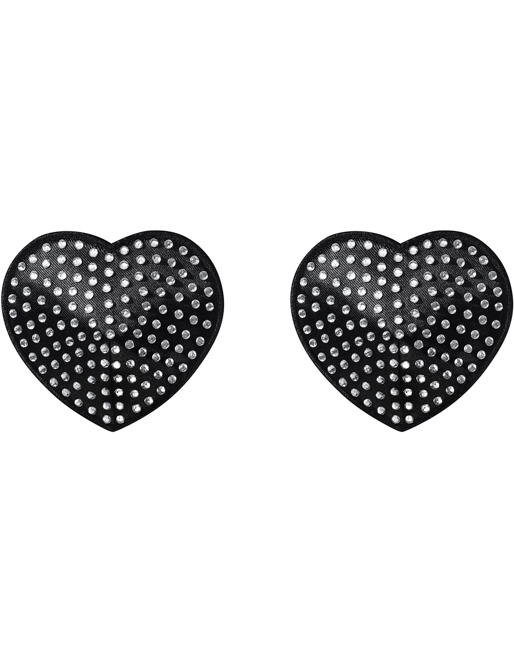 Mustast satiinist südamekujulised nibukatted ehiskividega. Korduvkasutatavad. Kleeplint hoiab nibukatteid paigal ka korduvalt kasutades. Kleepuva osa värskendamiseks pärast igat kasutamist toimige järgnevalt. Peske nibukatete kleepuv pool õrnalt puhta niiske svammi ja maheda seebiga. Laske neil õhu käes kuivada ja vahetage plastikkaitseid välja. Hoidke nibukatteid kindlalt suletud originaalkarbis, et neid tolmu- ja ebemevabana hoida. • mõõtmed: 5,8 x 5 cm • materjal: 50% polüester, 30% akrüül, 20% polüuretaan