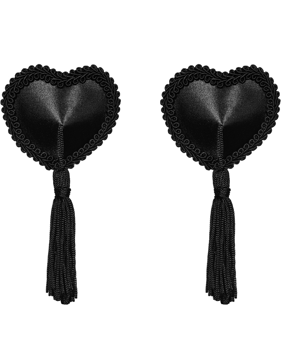 Mustast satiinist südamekujulised nibukatted tuttide ja punutud äärtega. Korduvkasutatavad. Kleeplint hoiab nibukatteid paigal ka korduvalt kasutades. Kleepuva osa värskendamiseks pärast igat kasutamist toimige järgnevalt. Peske nibukatete kleepuv pool õrnalt puhta niiske svammi ja maheda seebiga. Laske neil õhu käes kuivada ja vahetage plastikkaitseid välja. Hoidke nibukatteid kindlalt suletud originaalkarbis, et neid tolmu- ja ebemevabana hoida. • mõõtmed: 6 x 5 cm • materjal: 100% polüester