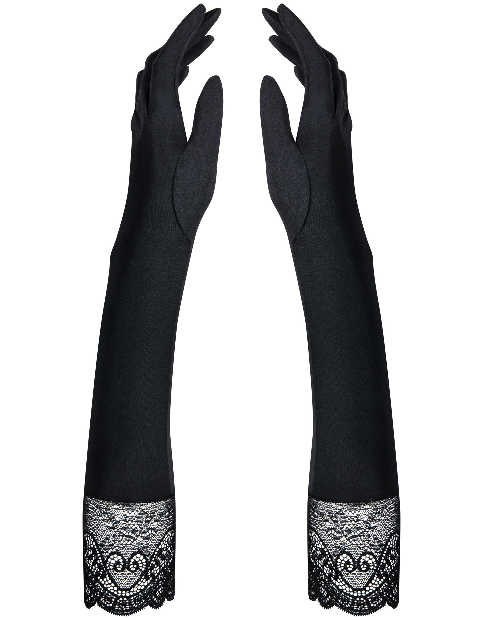 Elegantsed küünarnukini ulatuvad õhtukindad, mis on valmistatud pehmest mustast satiinist ja õrnadest pitsidest ja kaunistatud mustade ehiskividega. Üks suurus. Kangas: 85% polüamiid, 15% elastaan. Pesta käsitsi, maksimaalsel temperatuuril 30 °C.