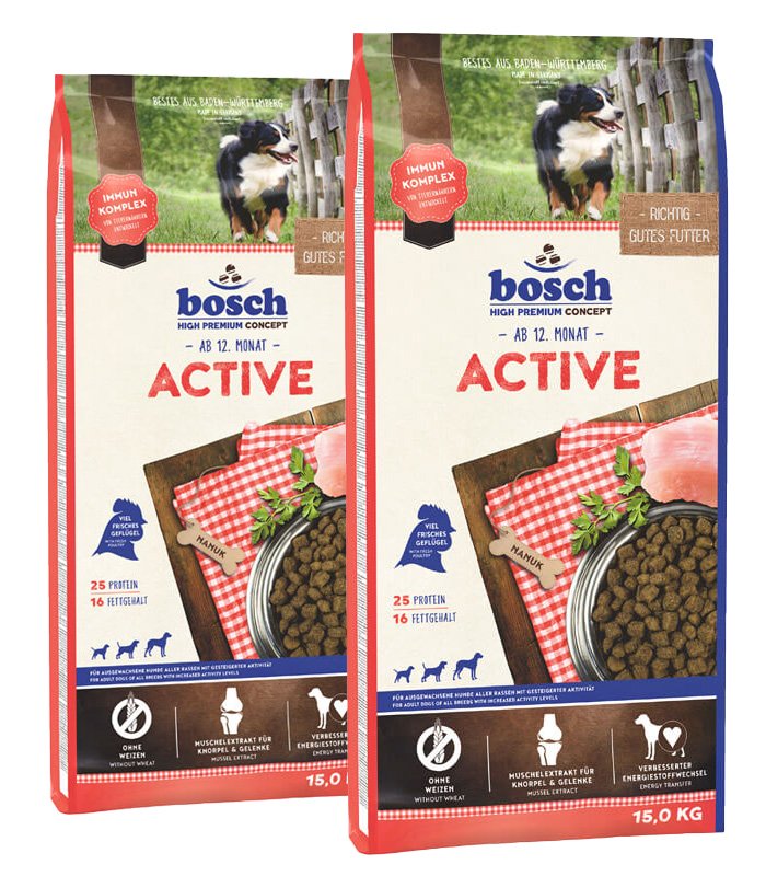 Bosch Active 15 kg Kuiv täistoit füüsiliselt aktiivsetele täiskasvanud koertele GTIN: 4015598013390 Koertele>Koeratoit ja maiused>Koerte kuivtoit | 41,82 € | Poodi | ||