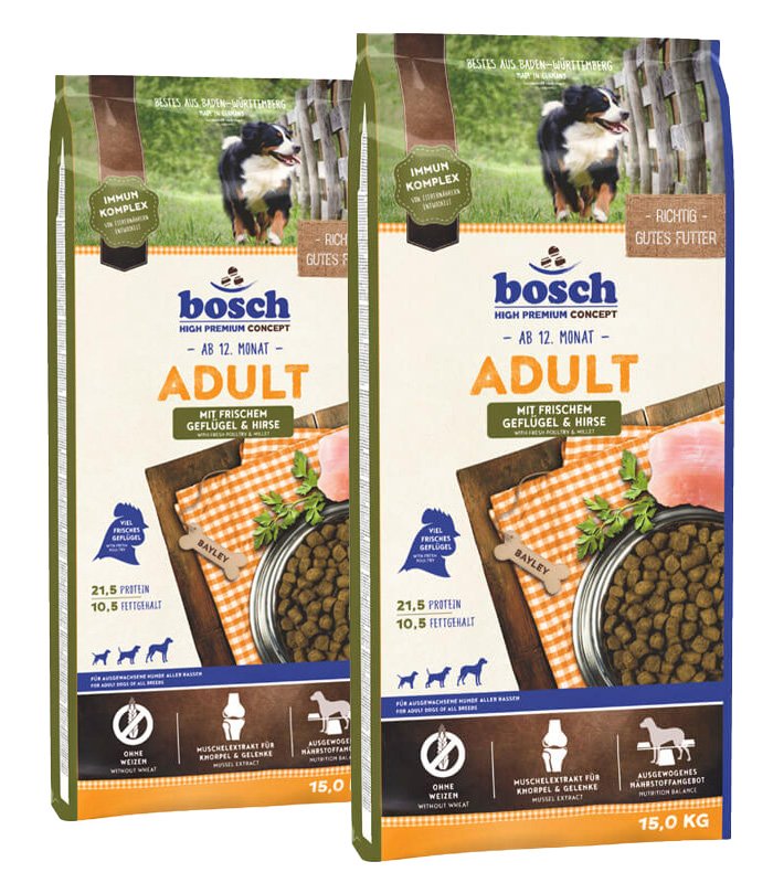 Bosch Adult koos kodulinnuliha ja hirsiga 15 kg GTIN: 4015598013161 Koertele>Koeratoit ja maiused>Koerte kuivtoit | 36,61 € | Poodi | ||