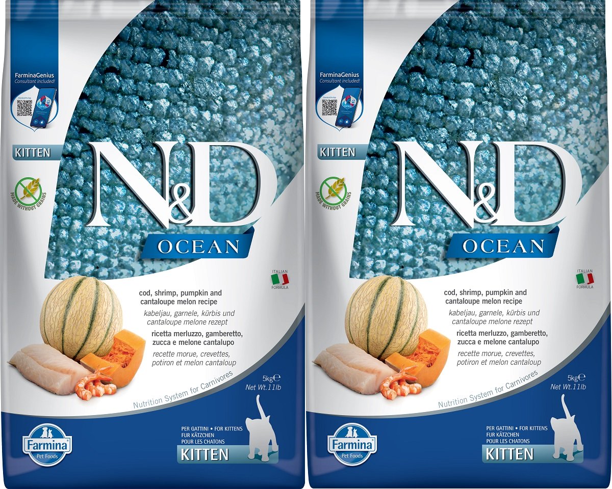 FARMINA N&D Ocean Cat Kitten tursk, krevetid, kõrvits ja melon kassipoegadele 2 x 5 kg