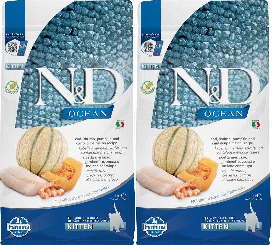 FARMINA N&D Ocean Cat Kitten tursa, krevettide, kõrvitsaga ja meloniga kassipoegade toit 2 x 1,5 kg