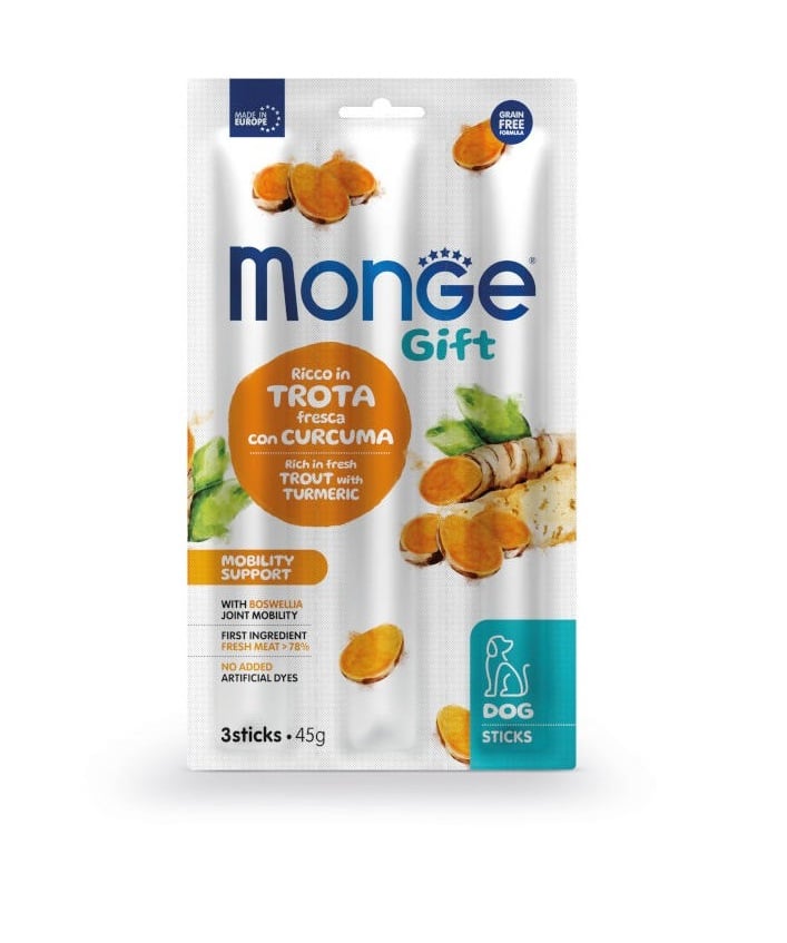 MONGE Dog Sticks Adult Forelliga kurkumaga 45g GTIN: 8009470085403 Tasuta | 25,00 € | Poodi | ||