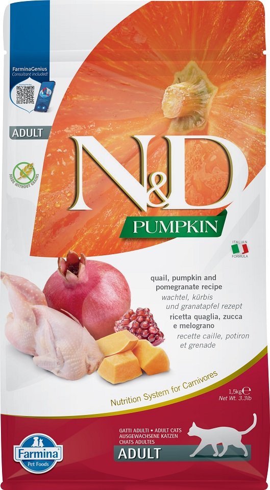 N&D Cat Pumpkin Quail & Pomegranate 1.5 kg Täiskasvanud kasside kuivtoit, mis ei sisalda teravilja ega gluteeni. GTIN: 8010276035387 Kassidele>Kassitoit ja maiused>Kasside kuivtoit | 25,30 € | Poodi | ||