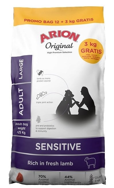 ARION Original Sensitive Adult Large Lamb Rice 15 kg (12 + 3 kg gratis) GTIN: 5414970061773 Koertele>Koeratoit ja maiused>Koerte kuivtoit | 59,99 € | Poodi | ||