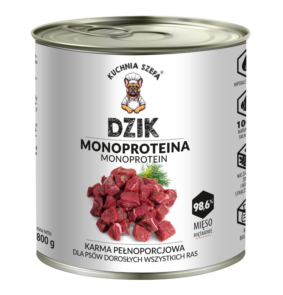 KUCHNIA SZEFA Monoproteina Wild boar 800g märgtoit koertele GTIN: 5901783960565 Koertele>Koeratoit ja maiused>Koerte märgtoit | 6,07 € | Poodi | ||