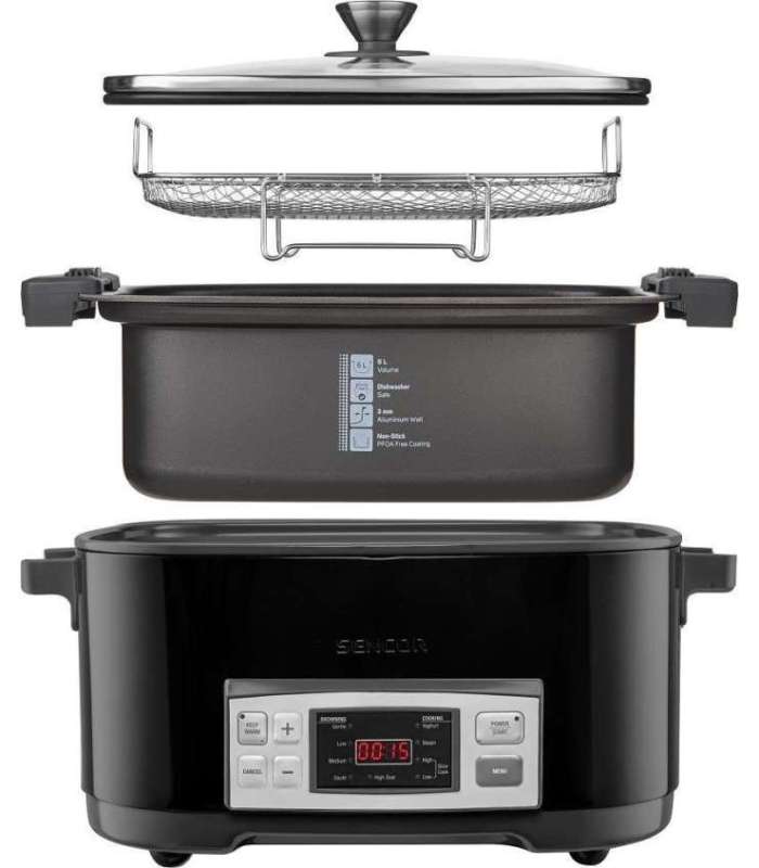 <p>Elegantse disainiga täisautomaatselt töötav aeglane keetja.</p><p><b>6-liitrine pott</b> on toidu kleepumist takistava PFOA-vaba kattega ja 3 mm paksusest alumiiniumisulamist seinaga. Seda võib paigutada külmkappi ning pesta nõudepesumasinas.<br /></p><p></p><p><b>5 eelseadistatud pruunistamisprogrammi </b>maitse sulgemiseks ja koostisosade karamelliseerimiseks (Õrn 100 °C, Madal 120 °C, Keskmine 150 °C, Sauté 170 °C, High Sear 180 °C)</p><p><b>4 eelseadistatud küpsetusfunktsiooni</b> (Madal aeglane küpsetamine 6-14 tundi, Kõrge aeglane küpsetamine 2-8 tundi, Aurutamine 5-120 min, Jogurt 6-12 tundi)</p><p><b>Taimer </b>reguleerimaks küpsetustemperatuuri ja aega ning <b>digitaalne LCD-juhtpaneel</b>. </p><p>Kahekordne kaanega lukustussüsteem tagab, et toidus säilib maksimaalne maitse ja aitab hoida keedupotis ühtlast temperatuuri</p><p><b>Keep warm funktsioon</b> hoiab pärast toiduvalmistamise lõppu automaatselt ideaalset temperatuuri.</p><p>Suur kvaliteetsest 304 <b>r</b><b>oostevabast terasest auruti </b>kala, pelmeenide või köögiviljade aurutamiseks.</p><p><b><i>Slow cooking</i> </b>on lihtne rasvavaba toiduvalmistamine, säilitades kõik maitsed ja vitamiinid ning jättes mahlad liha sisse. Säästab aega, raha, vett ja energiat. Suurepärane viis suppide, guljaši, moosi, lambaliha, veiseliha, köögiviljade, munade jne keetmiseks.</p><p>Kuumuskindlad käepidemed<br /></p><p>Karastatud klaasist kaas</p><p>Võimsus: 1350 W</p>