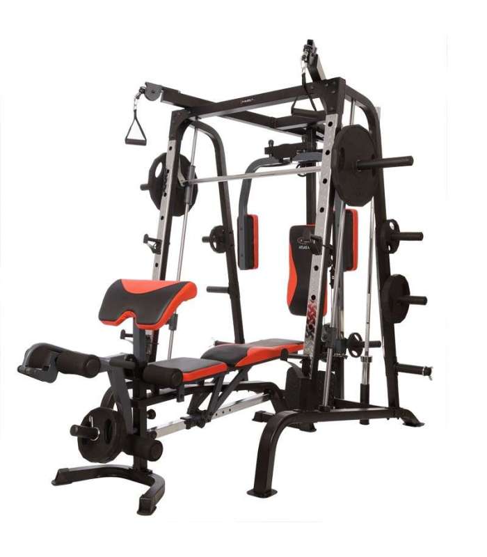 X2 HMS hone gym is amodern Smith machine. This multi-functional design will satisfy even the most demanding users.Atlas HMS X2 is a device for comprehensive training of the whole body. It is extensive equipment allows harmoniously develop both the upper and lower parts of the muscle. It’s up to the user to decide how to build a set of exercises to find the optimal formula.Smith machine Atlas HMS X2 consists of the most important instruments for the development of muscles. The main one is Smith machine, which due to the high quality bearings, runs extremely smoothly and quietly. More than that, they are: vertical butterfly, high pulleys, low pulley, leg developer station and preacher curl station. Such a wide range of instruments combined with the possibility of using free weights, making Atlas X2 HMS ideal device for people seriously thinking about systemic development of the muscles of the body.The central element of the Smith machine is multifunctional, solid bench – to conduct training in a standing position just pull it out. It is largely responsible for the comfort of the user, therefore, it is equipped with a multistage adjustment mechanism of the seat and backrest. For user comfort we equipped it also in durable sponge and a modern and durable upholstery with carbon fiber pattern.High quality Smith machine Atlas HMS X2 ensures trouble-free operation for a long time. Starting from the frame constructed from durable, powder-coated steel, through upholstery finish, the system of pulleys and rope tensioning device meets the highest technical and aesthetic standards. We recommend it to all people looking for a versatile and durable device for home use.Exercises for muscles:pectoralsback musclesabdominalsdeltoid musclesarms muscleslegs musclesEquipment:Smith machinevertical butterflywide-grip high pulleyhigh-pulley curlslow pulleyleg developer stationpreacher curl stationSpecification:Dimensions:length: 242 cm length without bench: 167 cmwidth: 205 cmheight: 219 cm frame: 60 × 2 × 1731 mmBar:length: 196 cmdiameter: 25 mmBearing in every pulleyLinear bearings in the mechanism of the Smith machineType of loading: free weightHooks for free weights, diameters 50 and 25 mmMultifunctional, solid benchModern and durable upholsteryCable tension adjustmentSupport system: 9 levelsSupport for the barAnkle strapPackages: 3 szt.Finish: powder-coated steelFrame color: blackMaximum load (weights + user weight): 272 kgMaximum weights on leg developer: 45kgMaximum weights on cross-over, lat pull: 90kgMaximum user weight: 135 kgTotal weight: 168 kgRemarks:24 months warrantyImporter: Abisal Ltd. | Poland | 41-807 Zabrze | Pyskowicka Street 17 | e-mail: abisal@abisal.plAbisal Ltd.. declares that the products sold by the company are safe and meet the requirements contained in the Act on General Product Safety of December 12, 2003. (Journal of Laws of December 31, 2003)