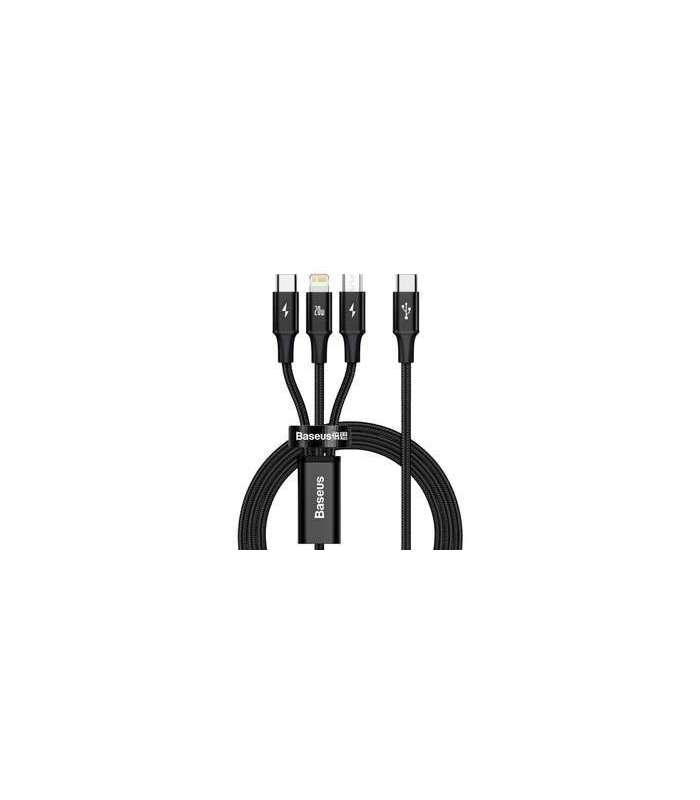 Baseus Rapid Series 3-in-1 cable USB-C For M+L+T 20W 1.5m Black GTIN: 6953156204294 Kaablid <h3>Baseus 3-in-1 Cable</h3> <p>Baseus CAMLT-SC01 is a practical cable that allows you to power up to 3 devices simultaneously. With Lightning, USB-C and micro USB connectors, it is compatible with all kinds of equipment - from the latest smartphones to small household appliances. The accessory supports fast charging of 20W, iP output enables fast charging as well as data transfer speeds of up to 480MB/s. Durable and universal - it will serve you perfectly for a long time.</p> (image) <h3>Save time</h3> <p>The cable allows you to quickly charge your Apple 8 or newer smartphones using a 20W PD charger. By opting for this solution, you will charge your iPhone to 60% with just 30 minutes! This is an excellent time saver. You can also use the cable to charge phones with a USB-C input at 3A and devices with a micro USB input at 2A. The accessory also supports 18W PD fast charging.</p> (image) <h3>Charge up to 3 devices simultaneously</h3> <p>No more waiting for one device to finish charging to connect another. Baseus 3-in-1 cable can power up to 3 devices at the same time. Conveniently charge your iPhone, Xiaomi or other smartphone with a USB-C input, as well as a powerbank or small lamp with a micro USB port - the configurations are almost unlimited. This practical accessory will bring you convenience and save you time.</p> (image) <h3>Provides security for your equipment</h3> <p>The cable is equipped with an advanced chip that is responsible for its safety and efficiency. It recognizes devices that support fast charging and adjusts the voltage and current to the connected devices. In this way, it provides unparalleled performance. The cable will instantly charge your phone while protecting it from overcharging.</p> (image) <h3>Instantly copy files</h3> <p>With a cable, you can also transfer files between devices in no time. The data transfer speed offered by the product is up to 480MB/s. Thanks to this you will be able to copy photos or videos from your phone to your computer in no time. You no longer need to wait for hours until your files are transferred - with Baseus cable it will take just a few moments.</p> (image) <h3>Surprise you with its incredible durability</h3> <p>The product is made of high quality materials that provide it with incredible durability. 5 copper conductors guarantee fast charging and reliable data transmission. Braided, nylon sheath is extremely durable. Thanks to it, the cable is distinguished by flexibility and resistance to bending, scratching and even breaking. Storage and transportation of the product is facilitated by a special Velcro fastener - thanks to it you will forget about annoying tangles and mess.</p> (image) <div class="table-wrapper"> <table> <tbody> <tr><th>Brand</th> <td>Baseus</td> </tr> <tr><th>Name</th> <td>Rapid Series 3-in-1 Fast Charging Data Cable</td> </tr> <tr><th>Model</th> <td>CAMLT-SC01</td> </tr> <tr><th>Material</th> <td>Aluminum alloy + braided nylon</td> </tr> <tr><th>Power</th> <td>PD 20W, compatible with PD 18W</td> </tr> <tr><th>Transmission speed</th> <td>iP/480MB/s</td> </tr> <tr><th>Input</th> <td>USB-C</td> </tr> <tr><th>Output</th> <td>Micro USB + Lightning + USB-C</td> </tr> <tr><th>Color</th> <td>Black</td> </tr> <tr><th>Length</th> <td>1.5m</td> </tr> </tbody> </table> </div> | 2-5 tp | 12,70 € | Poodi | |