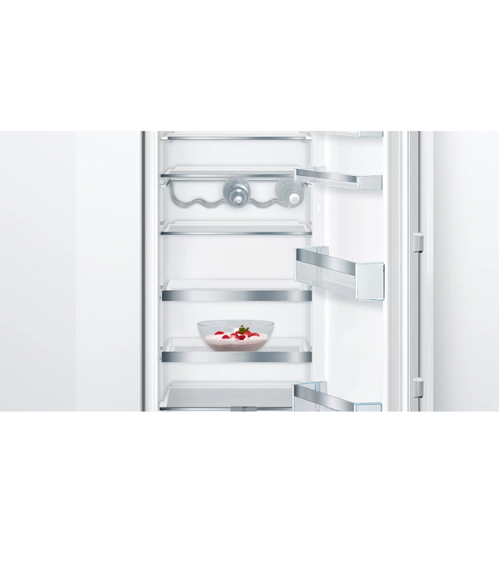 <p style="text-align:justify;"><strong>SuperCooling kaitseb juba jahutatud tooteid.</strong><br />SuperCooling-funktsiooni sisselülitamisel toimub hiljuti külmikusse pandud toidu jahutamine kiiremini. Samal ajal takistab funktsioon juba kapis leiduvate toodete soojenemist. Temperatuuri langetatakse ühe nupuvajutusega kõige rohkem väärtuseni 2 °C. Selleks, et vältida tarbetut energiakulu, taastatakse temperatuur automaatselt u 6 tunni pärast.</p><p style="text-align:justify;"><strong>FreshSense – suurepärane kliima toidu säilitamiseks.</strong><br />Optimaalses säilituskliimas säilib toidu konsistents. Näiteks muutub jäätis liiga kõvaks või vedelaks. Seetõttu oleneb püsivast sisetemperatuurist, kui kaua toit oma värskuse ja maitse säilitab. FreshSense-andurid kontrollivad ja juhivad pidevalt külmiku ja sügavkülmutusosa temperatuuri. Tulemuseks on püsiv tempearatuur, mis ei sõltu mingil moel ümbritsevat temperatuurist.</p><p style="text-align:justify;"><strong>VarioShelf, lisaruum – siis, kui vaja.</strong><br />Kaheks jaotatud VarioShelf-riiul on turvaklaasist ning seda saab hõlpsasti reguleerida, mis teeb toodete sissepaneku ja väljavõtmise hõlpsaks. See on ideaalne suurte esemete, nt püstiste pudelite ja kausside jaoks. Maksimaalne kohandatavus – kui on vaja rohkem ruumi. Riiuli üht poolt saab hõlpsasti teise alla keerata, mistõttu selle kasutamine on eriti paindlik.</p><p style="text-align:justify;"><strong>Lihtne käsitsemine, selge ülevaade.</strong><br />Teleskoopsiinidel või täielikel teleskoopsiinidel olevad mahutid libisevad sujuvalt ja ohutult seadmest välja. Neid on lihtne käsitseda ning need annavad hea ülevaate hoiustatud toidust.</p><p style="text-align:justify;"><strong>MultiBox-sahtel</strong><br />MultiBox-sahtel sobib puuviljade ja köögiviljade hoiustamiseks ning eriti suurte kaupade jaoks nagu lehtsalat on alati piisavalt ruumi.</p><p style="text-align:justify;"><strong>Kogu valgust Teie toodetele annab LED-valgustus.</strong><br />LED-valgustid kulutavad vähem energiat kui tavaliselt külmikuvalgustid. Valgustid valgustavad pimestamata kogu külmiku sisemust ka siis, kui seade on täis. Valgustus töötab kogu seadme tööea jooksul.</p><p style="text-align:justify;"><strong>EasyAccess Shelf – praktiline täita ja tühjendada.</strong><br />Turvaklaasist riiulid, mida saab poolenisti välja tõmmata. Niiviisi saab tooteid eriti mugavalt külmikusse panna või sealt välja võtta. Peale selle saate suurepärase ülevaate – ka tagapoole sattunud tooted paistavad välja ega unune.</p><p style="text-align:justify;"><strong>Hoiatusalarm</strong><br />Hoiatav helisignaal või valgusteavitus annab märku, kui uks ei ole suletud või tekkinud on mõni muu tõrge.</p><p style="text-align:justify;">Temperatuur elektrooniliselt reguleeritav, täpne näidik<br />VitaControl: püsiv temperatuur intelligentse sensortehnoloogia abil<br />Dünaamiline jahutus integreeritud ventilaatoriga<br />Akustiline hoiatussüsteem<br />Lamedad hinged<br />Jahekapis LED-sisevalgustus<br />Automaatne kiirjahutusfunktsioon<br />Üks teleskooprööbastel ja niiskusregulaatoriga sahtel VitaFresh plus - puu- ja köögiviljade värskus ja vitamiinid säilivad kuni kaks korda kauem.<br />Üks teleskooprööbastel sahtel MultiBox - läbipaistev, lainelise põhjaga sahtel, ideaalne puu- ja köögiviljade säilitamiseks.<br />7 turvaklaasist riiulit (6 reguleeritava kõrgusega), millest alumine riiul, 2 klaasplaat pikendatav<br />Spetsiaalne pudelirest, läikiv kroom<br />Kaitseukse paigaldamissüsteem: Fikseeritult kinnitatud<br />Avatud ukse hoiatussignaal, Külmiku supersäte, Külmiku temperatuuriekraan</p>