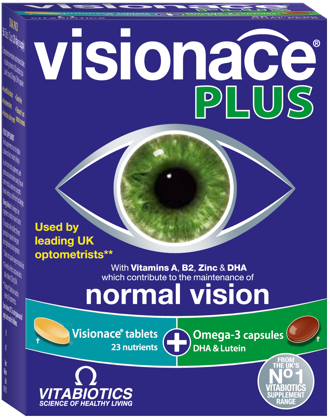 Tootetutvustus Toidulisand Visionace® Plus tabletid N28 + kapslid N28. Visionace® Plus toidulisand sisaldab antioksüdante, bioflavonoide, naturaalseid karotenoide (luteiini ja zeaksantiini) ning mustikaekstrakti. Vitamiinide/antioksüdantide toime on tähtsaim silmaläätsele ja silma võrkkestale, mille seisund aastate jooksul võib keskkonnategurite kahjuliku mõju ning vanuse tõttu halveneda. C-vitamiin on eriti tähtis silmaläätsele, B-vitamiinide kompleks aga on vajalik silmanärvi normaalseks funkt...