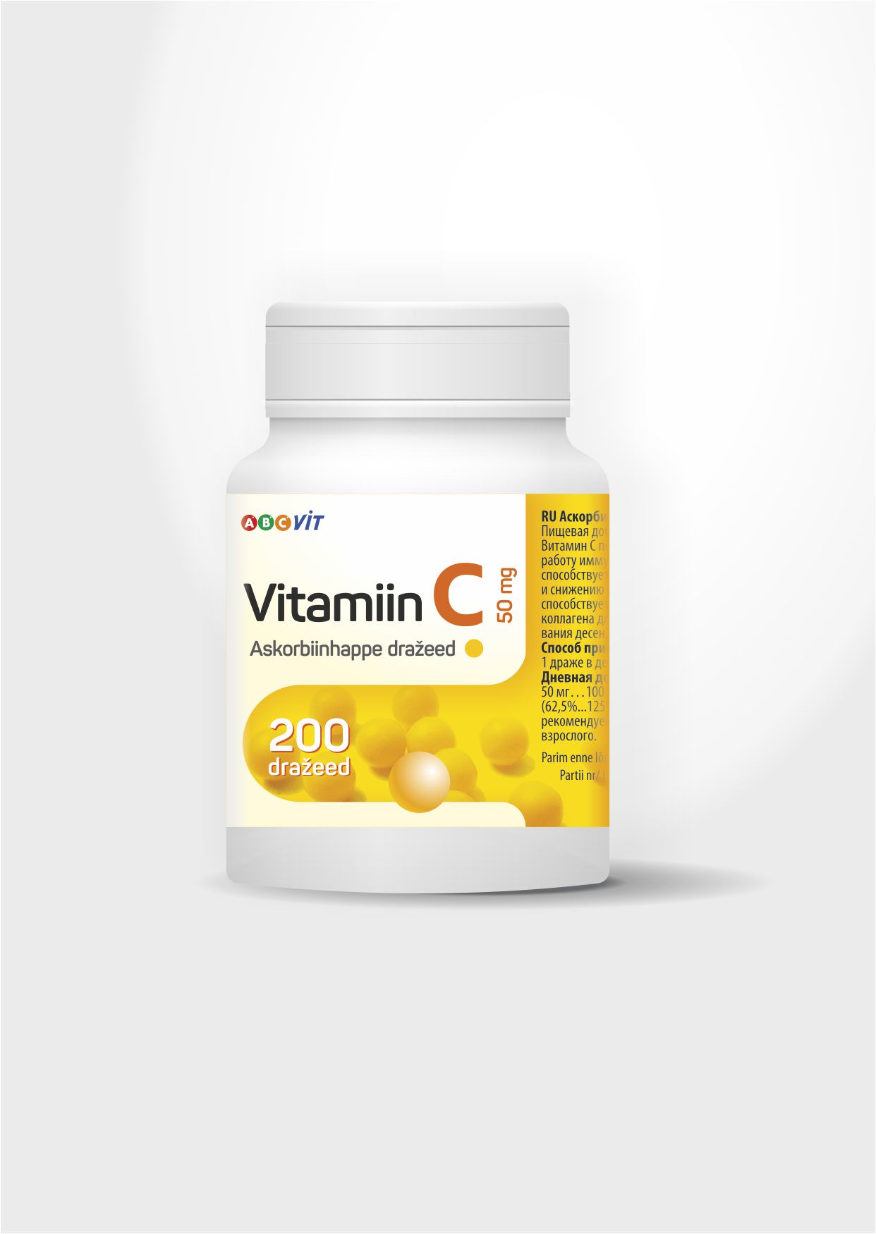 Tootetutvustus Askorbiinhappe dražeed. Toidulisand suhkruga. 200 dražeed. Vitamiin C aitab kaasa immuunsüsteemi ja närvisüsteemi normaalsele talitlusele ning aitab vähendada väsimust ja kurnatust. Vitamiin C aitab kaasa kollageeni normaalsele moodustumisele hammaste, igemete, luude ja naha normaalseks talitluseks. Päevaseks tarbimiseks soovitatav kogus ning tarvitamisjuhised Annustamine: lastele alates 5. eluaastast 1 dražee päevas, täiskasvanutele 1-2 dražeed päevas. Sisaldus päevase annuse koh...