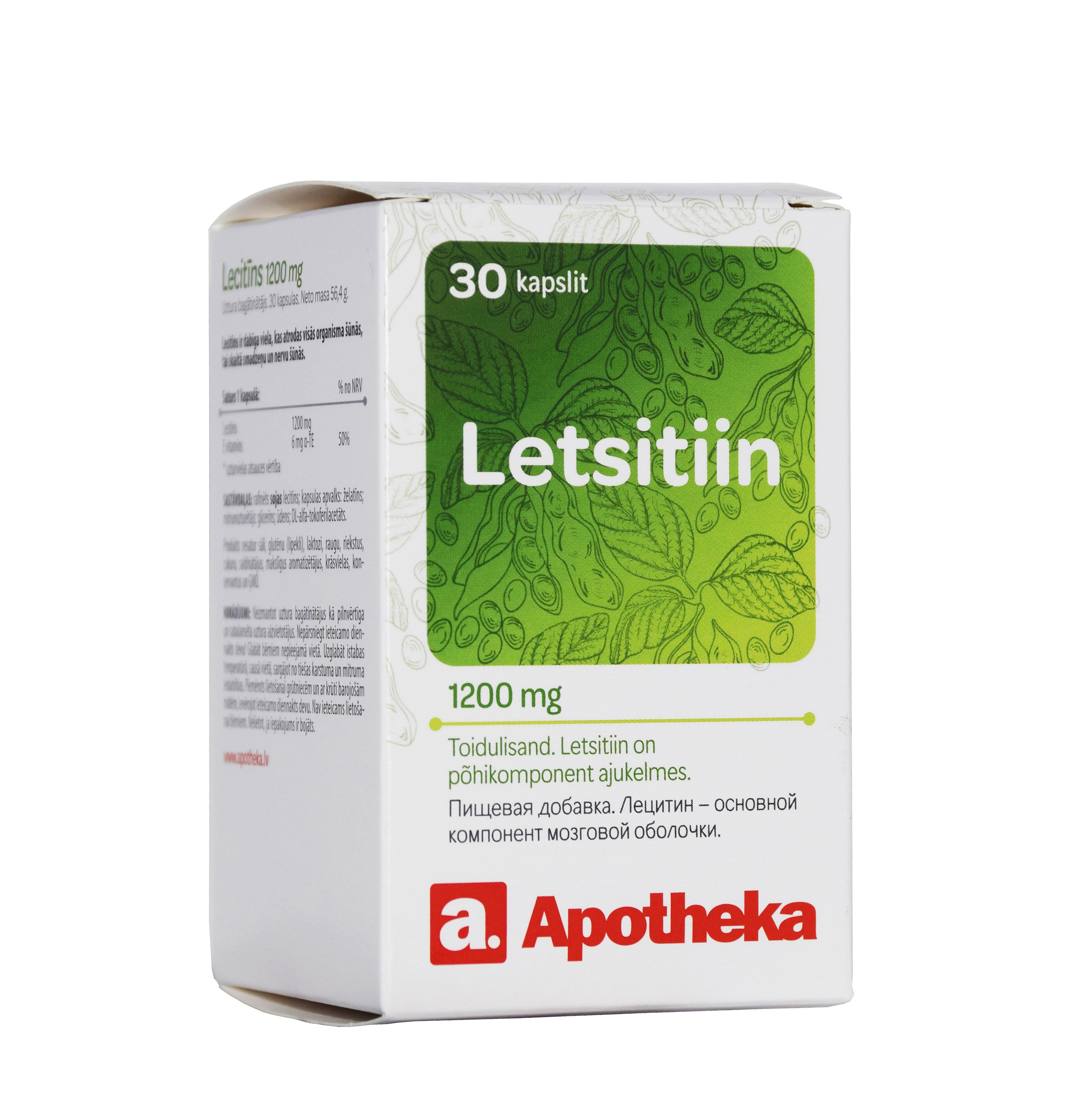 Tootetutvustus Sisaldab vitamiin E-d, mis aitab kaitsta rakke oksüdatiivse stressi eest. Päevaseks tarbimiseks soovitatav kogus ning tarvitamisjuhised Täiskasvanutel 1 kapsel päevas, koos toiduga. Sisaldus päevase annuse kohta Päevane annus 1 kapsel sisaldab: %NRV* Letsitiin 1200 mg Vitamiin E 6 mg alfa-TE 50% * protsent päevasest võrdluskogusest täiskasvanutel Koostisosade loetelu (allergiat või talumatust põhjustav koostisosa või abiaine märgitud TRÜKITÄHTEDES) Täielikult rafineeritud sojalets...