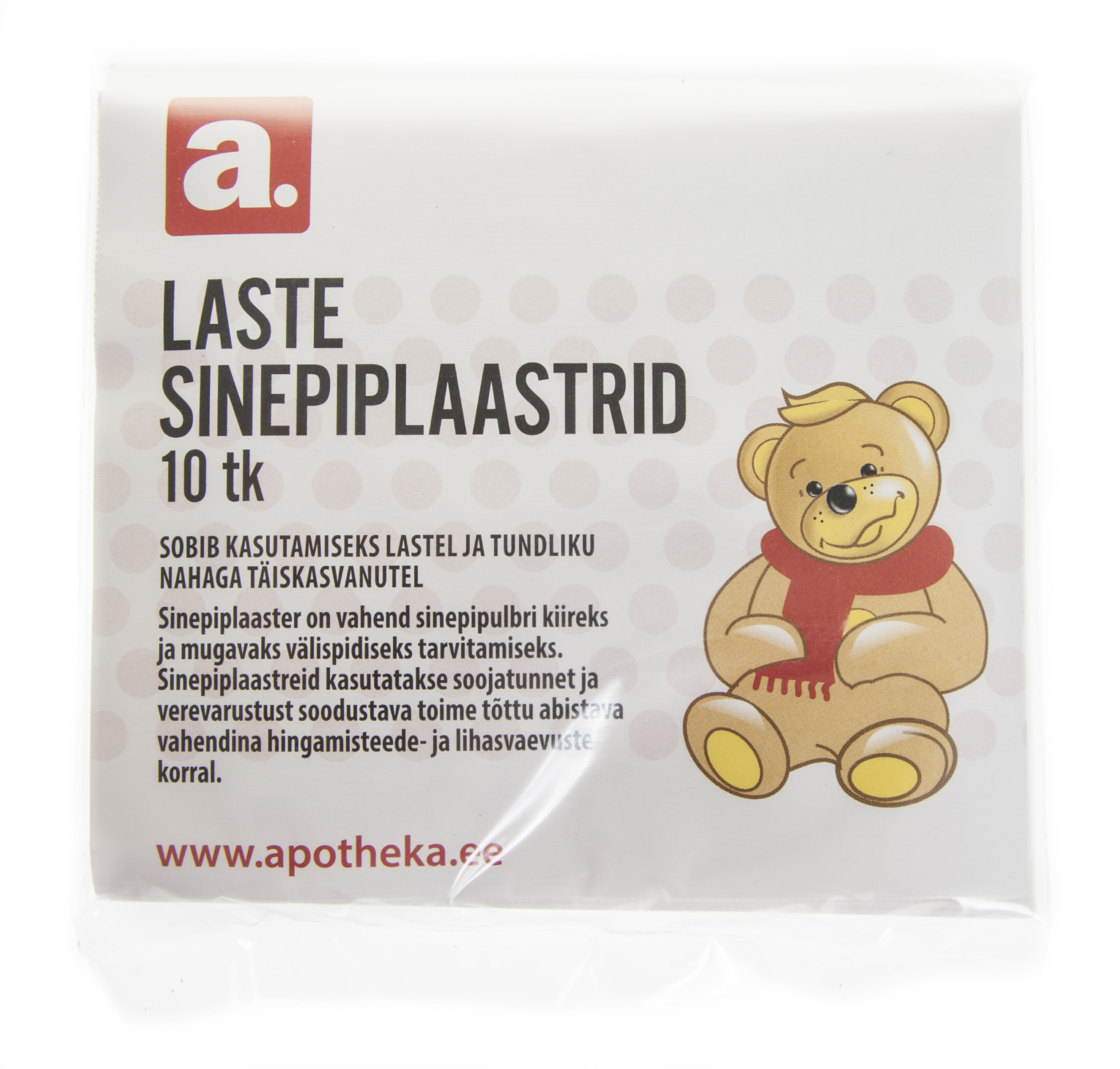 Laste sinepiplaastrid. Sobivad kasutamiseks lastel ja tundliku nahaga täiskasvanutel. Sinepiplaaster on vahend sinepipulbri kiireks ja mugavaks välispidiseks tarvitamiseks. Sinepiplaastreid kasutatakse soojatunnet ja verevarustust soodustava toime tõttu abistava vahendina hingamisteede- ja lihasvaevuste korral. Kasutamisjuhised Raputada sinepiplaastrit horisontaalasendis, et sinepipulber jaotuks ühtlaselt plaastril oleval igal neljal lahtril. Hoida plaastrit 3-4 sekundit...