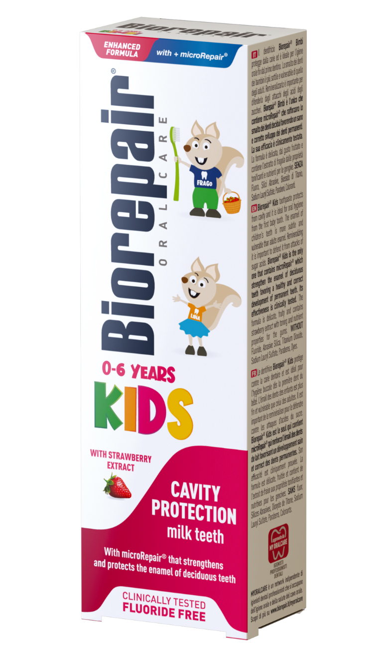 BIOREPAIR® kids – Fluoriidivaba laste hambapasta. Maasikamaitseline. Kaitseb hambaaukude eest ning teeb hambad tugevamaks ja tervemaks. See on ainus hambapasta, mis sisaldab hambaaukude tekke vastu võitlevat ja hambaemaili tugevdavat microRepair®-i. Tootes sisalduval maasikaekstraktil on toniseeriv toime ning see varustab igemeid toitainetega. Hambapastat soovitatakse kasutada ka hambaklambrite kandmise ajal, et varustada hambaemaili mineraalainetega. Hambapasta spetsiaa...