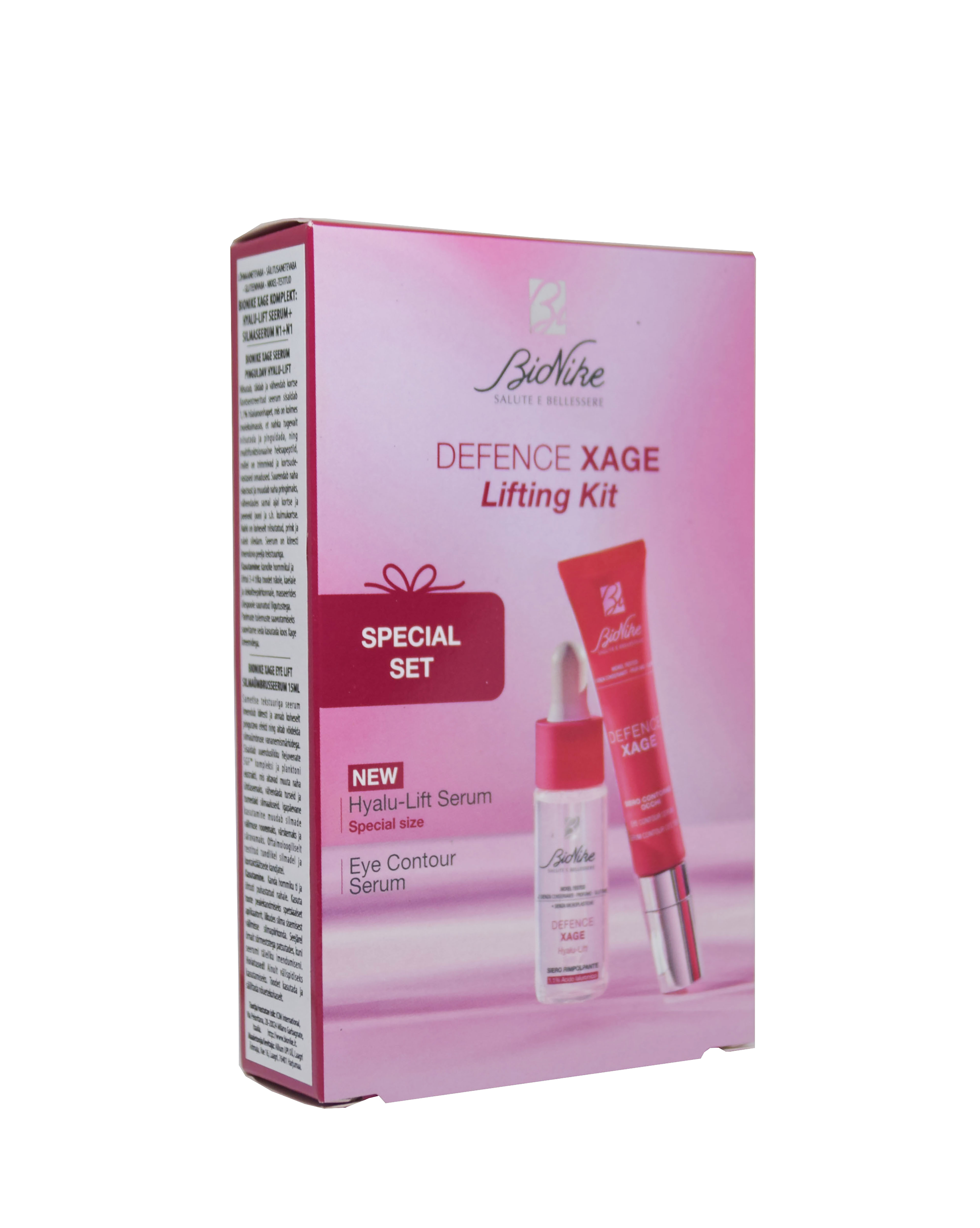 Piiratud koguses, spetsiaalne BIONIKE XAGE KOMPLEKT pinguldava toimega Komplekti kuulub UUS XAGE HUALU-LIFT näoseerum 10ML ja silmaümbruseseerum 15ML SÄILITUSAINETEVABA • GLUTEENIVABA • LÕHNAAINETEVABA • NIKKEL-TESTITUD BIONIKE XAGE SEERUM PINGULDAV HYALU-LIFT 10ML Niisutab, täidab ja vähendab kortse Kontsentreeritud seerum sisaldab 1,1% hüaluroonhapet, mis on kolmes molekulmassis, et nahka tugevalt niisutada ja pinguldada, ning multifunktsionaalne heksapeptiid, millel o...