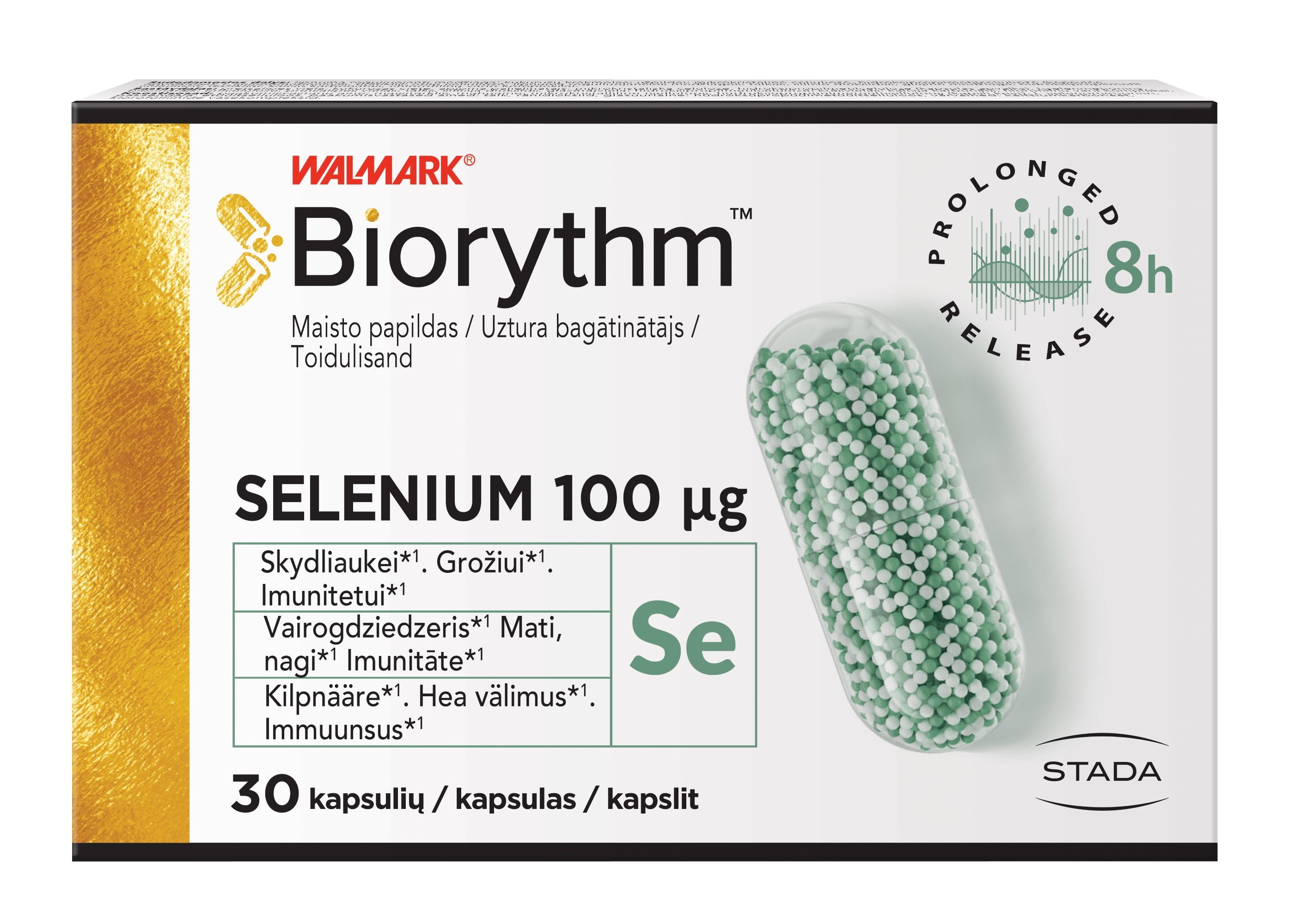 Tootetutvustus Biorythm SELENIUM 100 µg 30 kapslit Toidulisand. Kilpnääre*1. Hea välimus*1. Immuunsus*1 Biorythm™ sarja tootmisel kasutatakse toidulisandite jaoks uuenduslikku ja ainulaadset tehnoloogiat - Sustained Release (SR) - tehnoloogia toimeainete pikendatud vabanemiseks. Erilised mikrograanulid vabastavad toimeaineid 8 tunni jooksul. *1Seleen - aitab kaasa kilpnäärme normaalsele talitlusele - aitab hoida juukseid ja küüsi normaalsetena - aitab kaasa immuunsüsteemi normaalsele talitlusele...