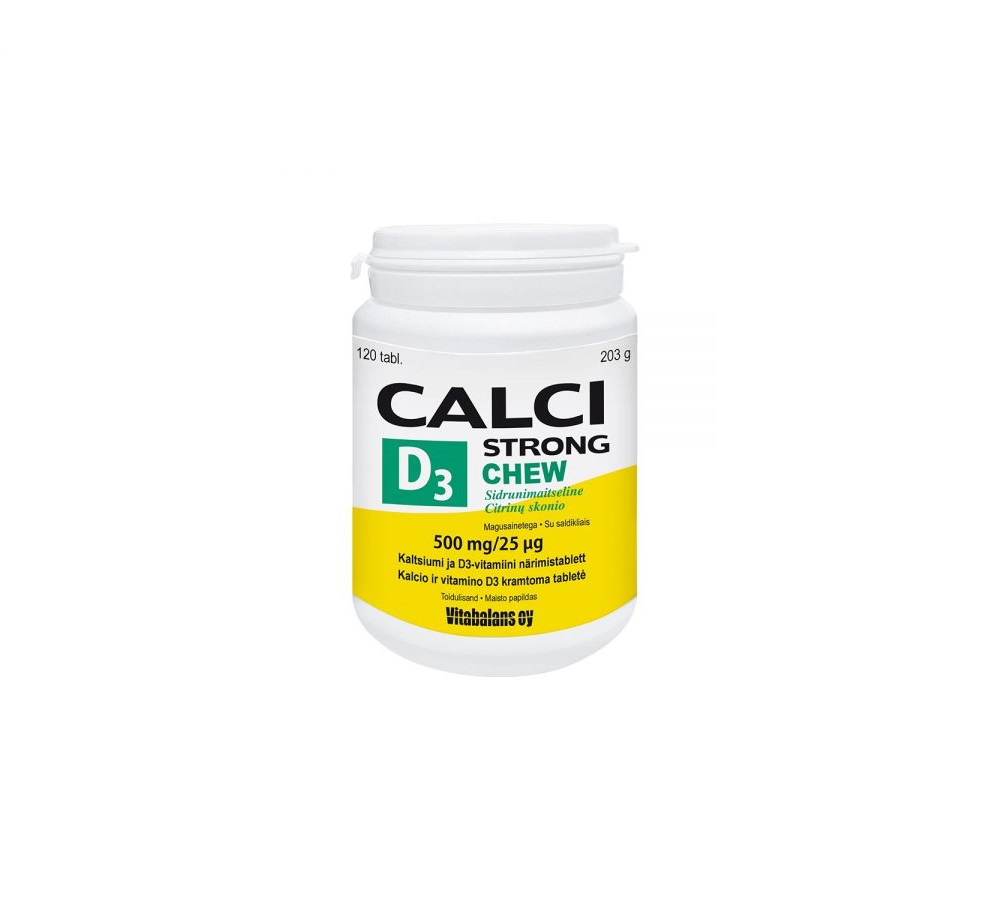 Tootetutvustus Toidulisand magusainetega. Kaltsium on vajalik, et hoida luid ja säilitada normaalseid hambaid. Vitamiin D aitab kaasa kaltsiumi imendumisele ja normaalsele vere kaltsiumisisaldusele. Päevaseks tarbimiseks soovitatav kogus ning tarvitamisjuhised 1 närimistablett päevas. Sisaldus päevase annuse kohta Soovitatav päevane annus 1 tablett sisaldab kaltsiumi 500 mg ( 63 %*), D3-vitamiini 25 µg (500%*) *%NRV - protsent päevasest võrdluskogusest täiskasvanutele. Koostisosade loetelu (alle...