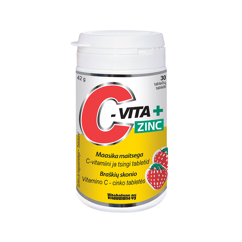 Tootetutvustus Toidulisand suhkru ja magusainetega. Maasikamaitselised närimistabletid. Vitamiin C ja tsink aitavad kaasa immuunsüsteemi normaalsele talitlusele. C-vitamiin aitab vähendada väsimust ja kurnatust. Päevaseks tarbimiseks soovitatav kogus ning tarvitamisjuhised Täiskasvanutele 1 tablett päevas. Lasta tabletil suus sulada. Sisaldus päevase annuse kohta 1 tablett sisaldab C-vitamiini 500 mg (625%*), tsinki 15 mg (150%*) * %NRV- protsent päevasest võrdluskogusest täiskasvanutele. Koosti...