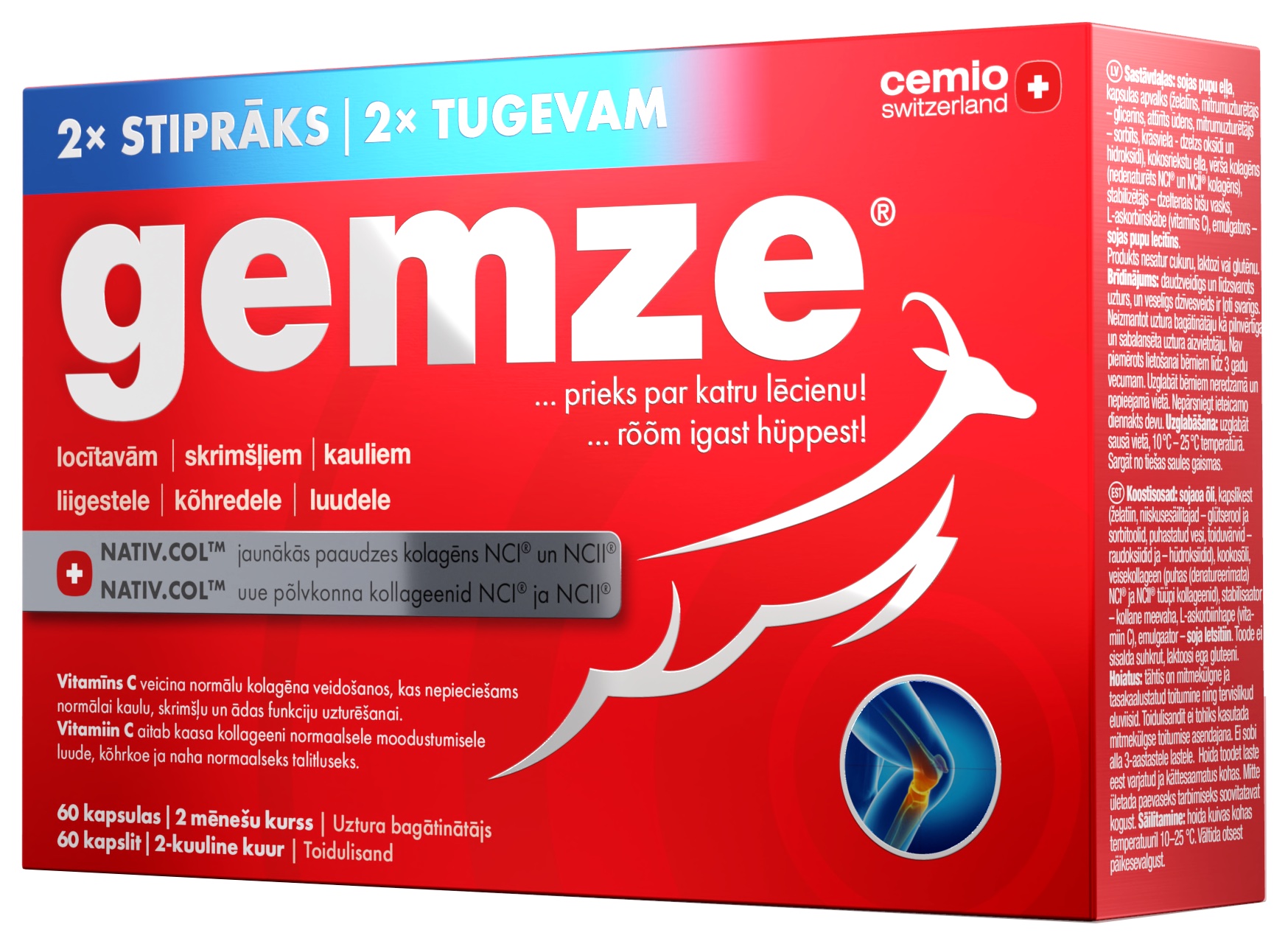 Tootetutvustus liigestele / kõhredele / luudele NATIV.COL™ uue põlvkonna kollageenid NCI® ja NCII® Cemio GEMZE® sisaldab uue põlvkonna kollageene NCI® ja NCII®. Tänu spetsiaalsetele töötlemistehnoloogiatele säilitab kollageen NATIV.COL™ oma esialgse kolmikheeliksi struktuuri ja bioloogilise aktiivsuse. • I tüübi kollageeni leidub sidemetes ja kõõlustes. See kollageen on orgaanilise luu põhiosa. I tüübi kollageen moodustab 90 % kõigist organismis leiduvatest kollageenidest. Ainet on leitud ka nah...