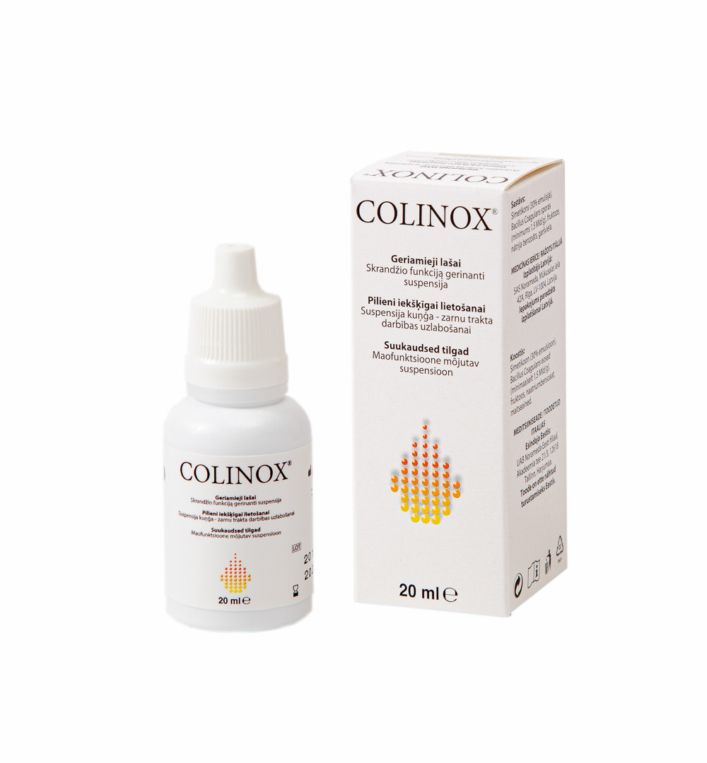 Colinox® on mao funktsioone mõjutav karamelli värvi suspensioon, mis sisaldab simetikooni ja Bacillus coagulans. Suspensiooni on lihtne manustada, kuna seda annustatakse tilkadena. See on mehaanilise toimega medistiiniseade. Tema toimel väheneb gaasimullide kogunemine soolestikus. Näidustused: Kasutatakse kõhupuhituse, aerofaagia, meteorismi, gaasi koolikate puhul imikutel, lastel ja täiskasvanutel, isegi kui esinevad soolestiku mikroflooras muutused. Kasutatakse ka seed...