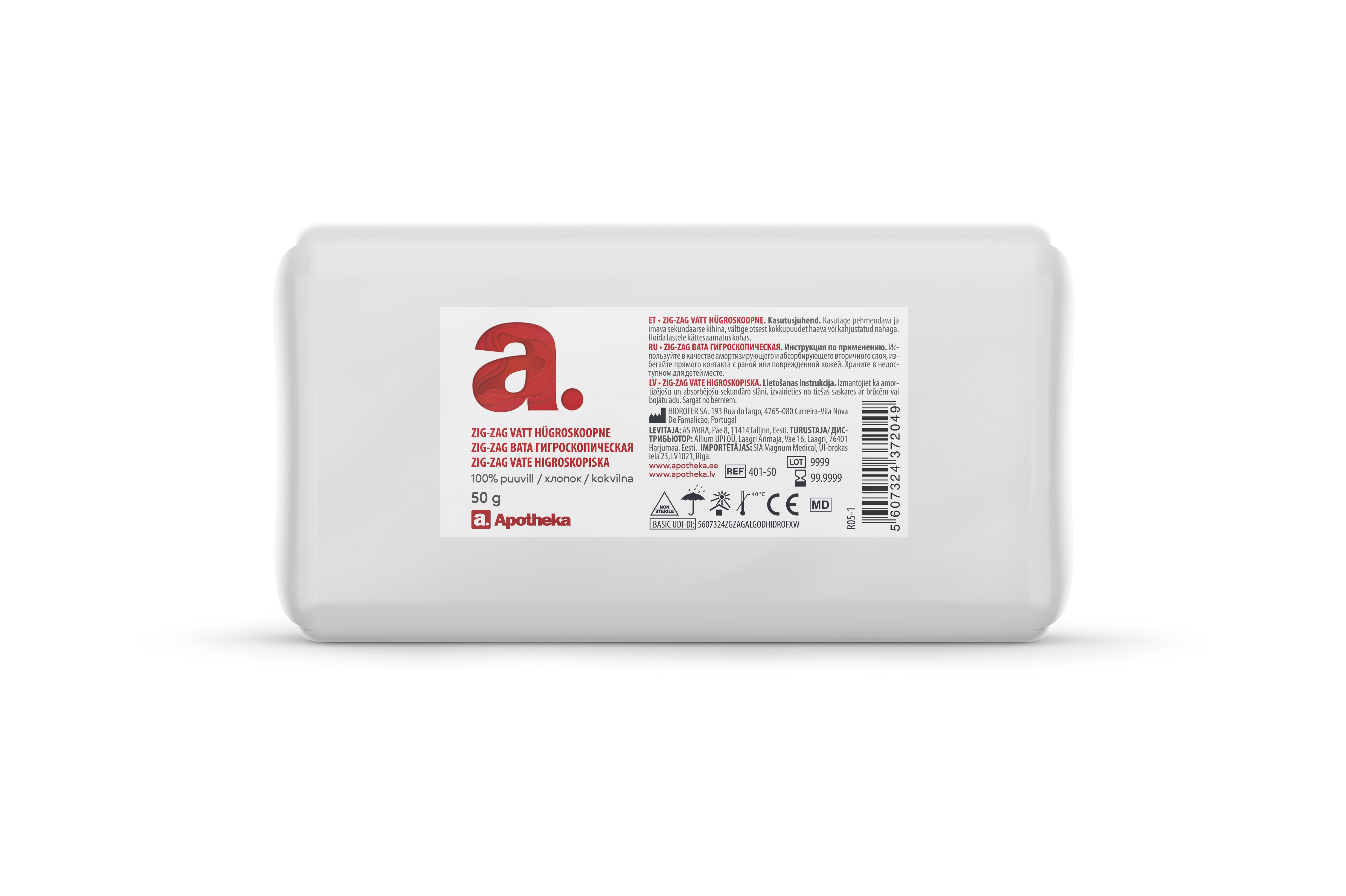 Meditsiiniline, mittesteriilne, hüdroskoopne vatt. Ei sisalda kloori. Kasutamisjuhised Kasutage pehmendava ja imava sekundaarse kihina, vältige otsest kokkupuudet haava või kahjustatud nahaga. Koostisosade loetelu 100% puuvill Hoiatused ja ettevaatusabinõud Hoida lastele kättesaamatus kohas. Säilitamistingimused Hoida kuivas kohas. Seadme ja pakendi sisu 50g Tootja või tootja volitatud esindaja Tootja: HIDROFER SA. 193 Rua do largo, 4765-080 Carriera-Vila Nova De Famalic...