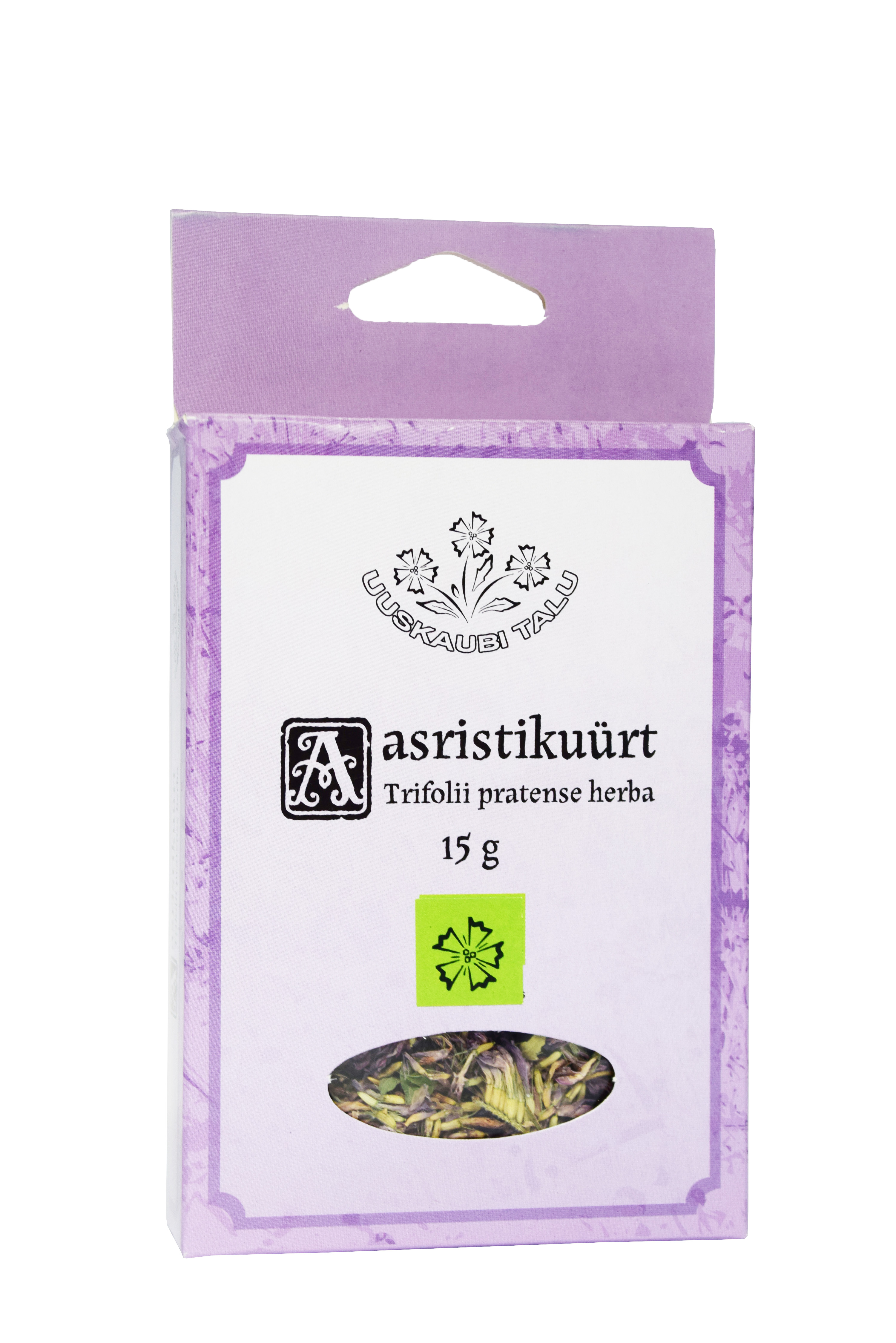 Tootetutvustus Kuivatatud aasristikuõied ja -lehed. Trifolii pratense herba Päevaseks tarbimiseks soovitatav kogus ning tarvitamisjuhised Soovituslik kogus 2 klaasi teed päevas Tee valmistamine: 1 spl. õisi valatakse üle 1 kl. keeva veega; lastakse aeg-ajalt segades tõmmata 10-45 min. Kurnata. Sisaldus päevase annuse kohta 4 g Koostisosade loetelu (allergiat või talumatust põhjustav koostisosa või abiaine märgitud TRÜKITÄHTEDES) Kuivatatud aasristikuürt. (Trifolii pratense herba) Hoiatused Mitte...
