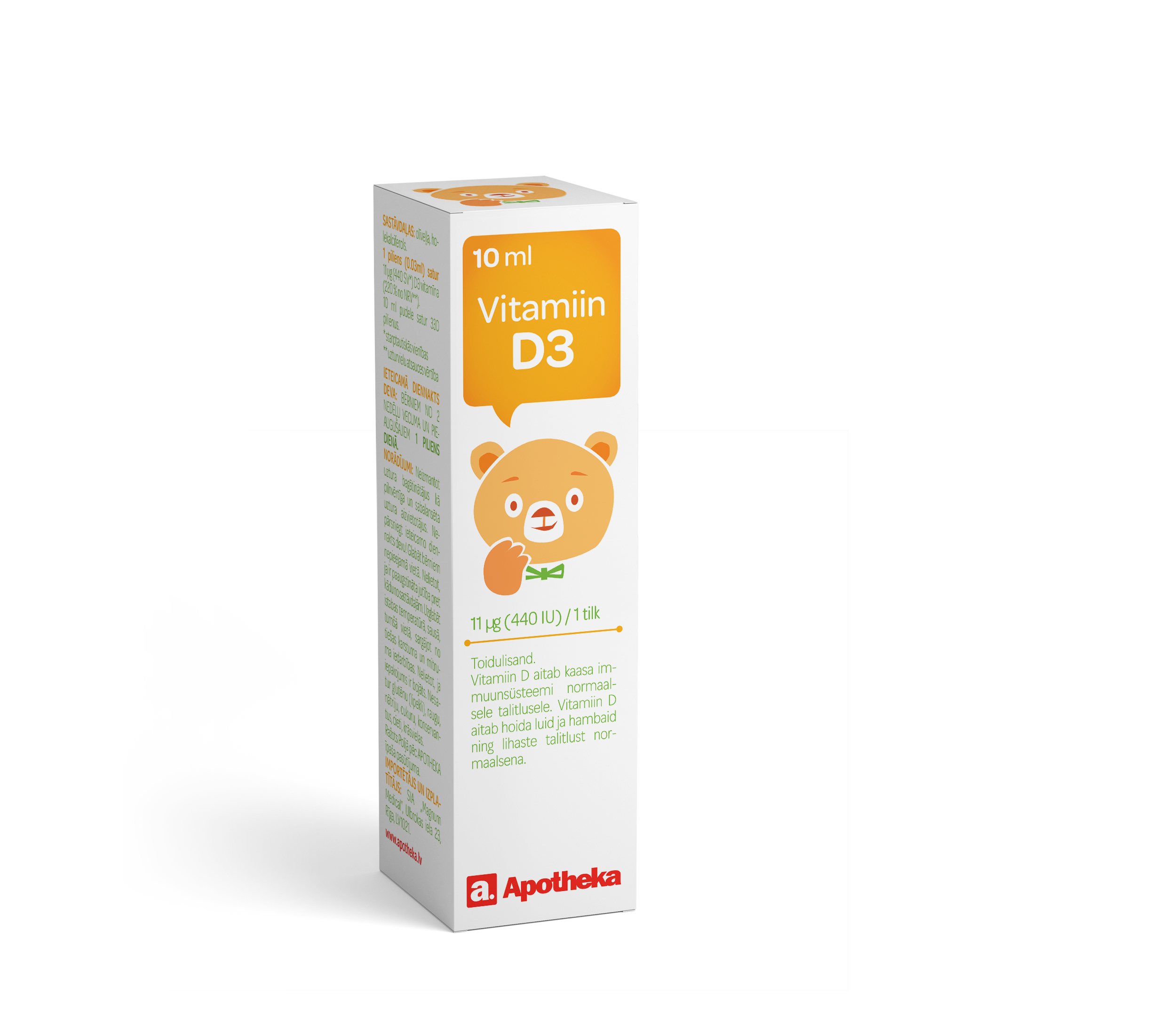 Tootetutvustus Vitamiin D3 tilgad. 11 µg (440 IU) ühes tilgas. Toidulisand. Vitamiin D aitab kaasa immuunsüsteemi normaalsele talitlusele. Vitamiin D aitab hoida luid ja hambaid ning lihaste talitlust normaalsena. Päevaseks tarbimiseks soovitatav kogus ning tarvitamisjuhised Lastel alates 2. elunädalast ja täiskasvanutel 1 tilk päevas. Sisaldus päevase annuse kohta 1 tilk (0,03 ml) sisaldab: 11 µg vitamiini D3 (220%*). * protsent päevasest võrdluskogusest täiskasvanutel 10 ml pudelis on 330 tilk...