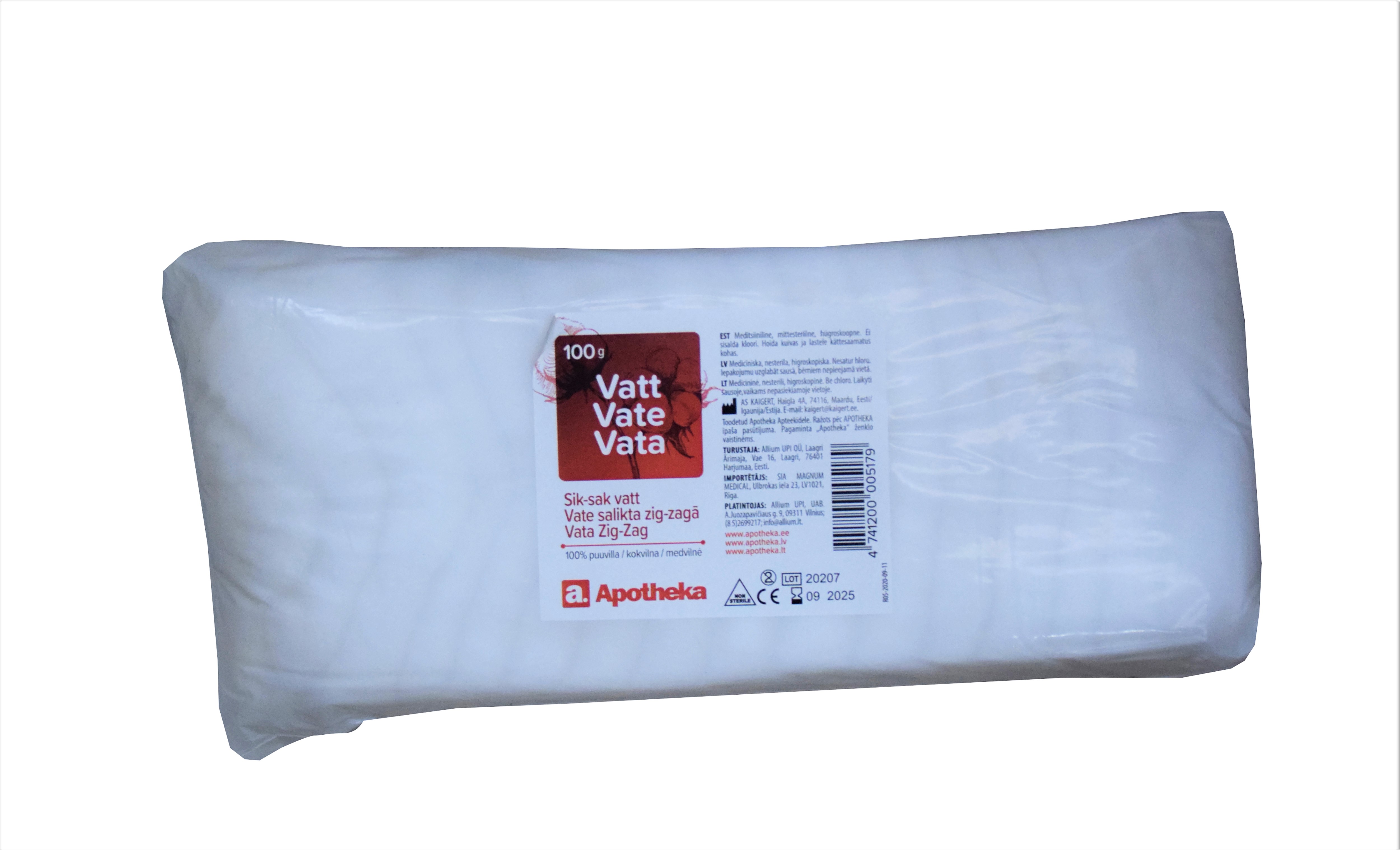 Sik-sak vatt. Kasutamisjuhised Meditsiiniline, mittesteriilne, hügroskoopne. Koostisosade loetelu 100% puuvilla. Ei sisalda kloori. Hoiatused ja ettevaatusabinõud Hoida lastele kättesaamatus kohas. Säilitamistingimused Hoida kuivas kohas. Seadme ja pakendi sisu 100 g Tootja või tootja volitatud esindaja Tootja: AS KAIGERT, Haigla 4A, 74116, Maardu, Eesti. E-mail: kaigert@kaigert.ee. Toodetud Apotheka apteekidele. Turustaja: Allium UPI OÜ, Laagri Ärimaja, Vae 16, Laagri, ...