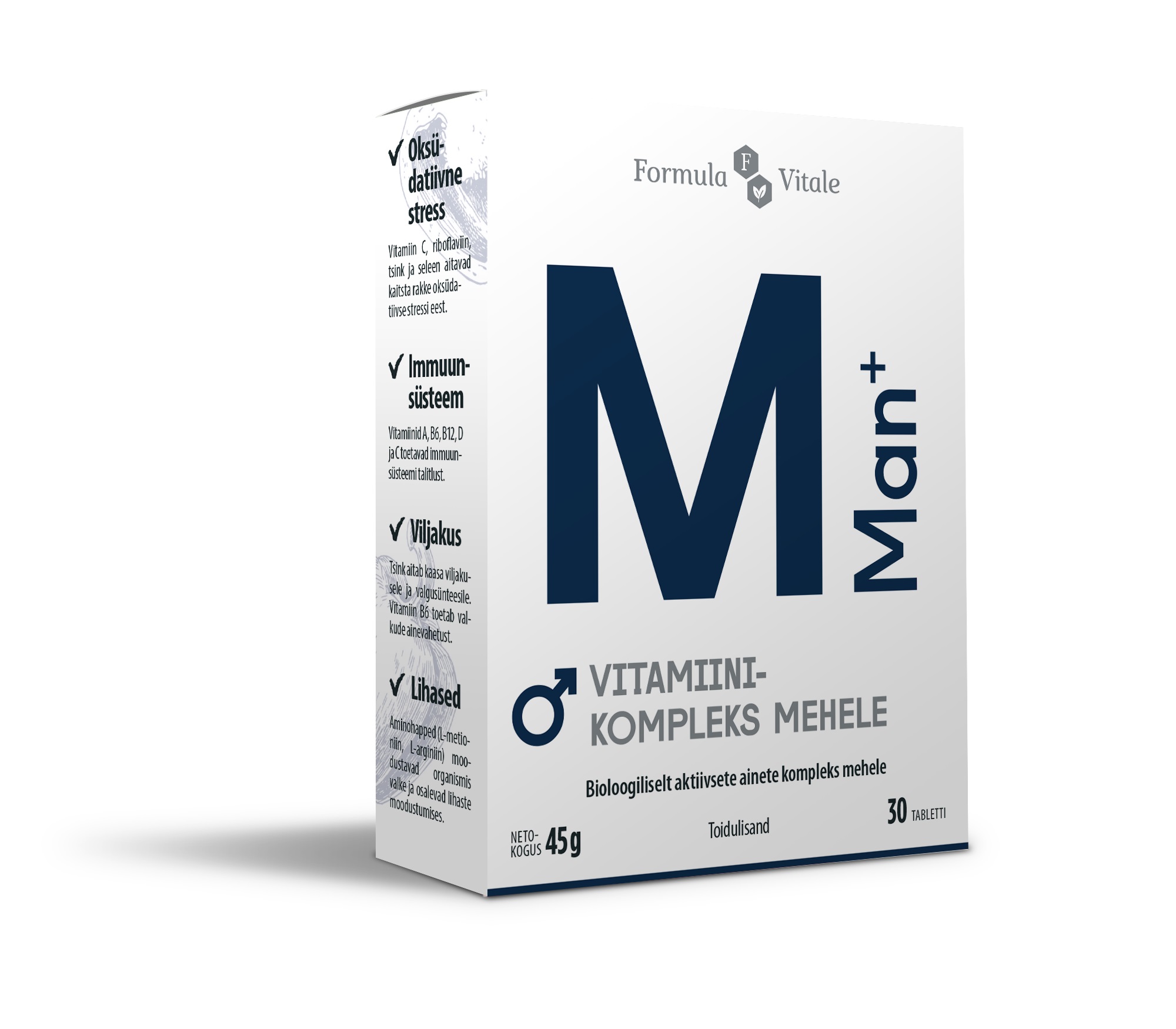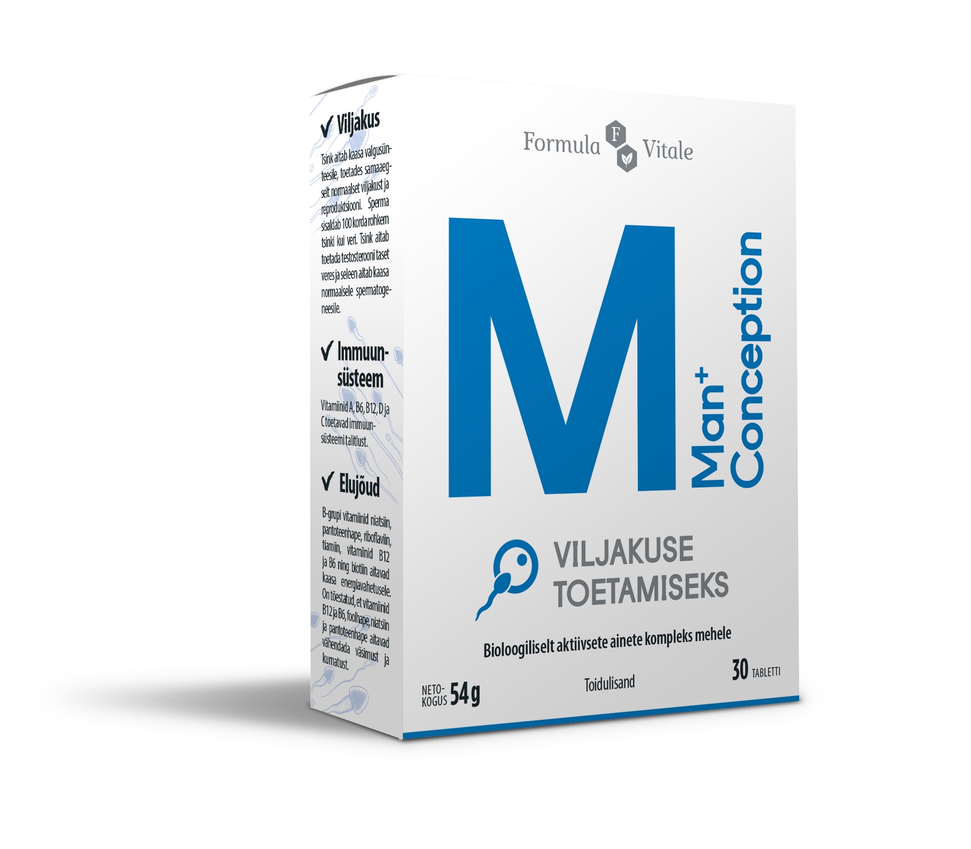Tootetutvustus Formula Vitale - ENERGIAT IGASSE PÄEVA! MAN+ CONCEPTION on bioloogiliselt aktiivsete ainete kompleks, mis täiendab tasakaalustatult MEHE organismi oluliste vitamiinide, mineraaltoitainete ja taimsete koostisosadega. MAN+ CONCEPTION toetab viljakust ja reproduktsiooni ning immuunsüsteemi ja elujõudu. RAKKUDE KAITSMINE Sisaldab tugevaid antioksüdante C- ja E-vitamiin, tsink ja vask, mis aitavad kaitsta rakke oksüdatiivse stressi eest. Oksüdatiivne stress on olukord, kus oksüdatiivse...