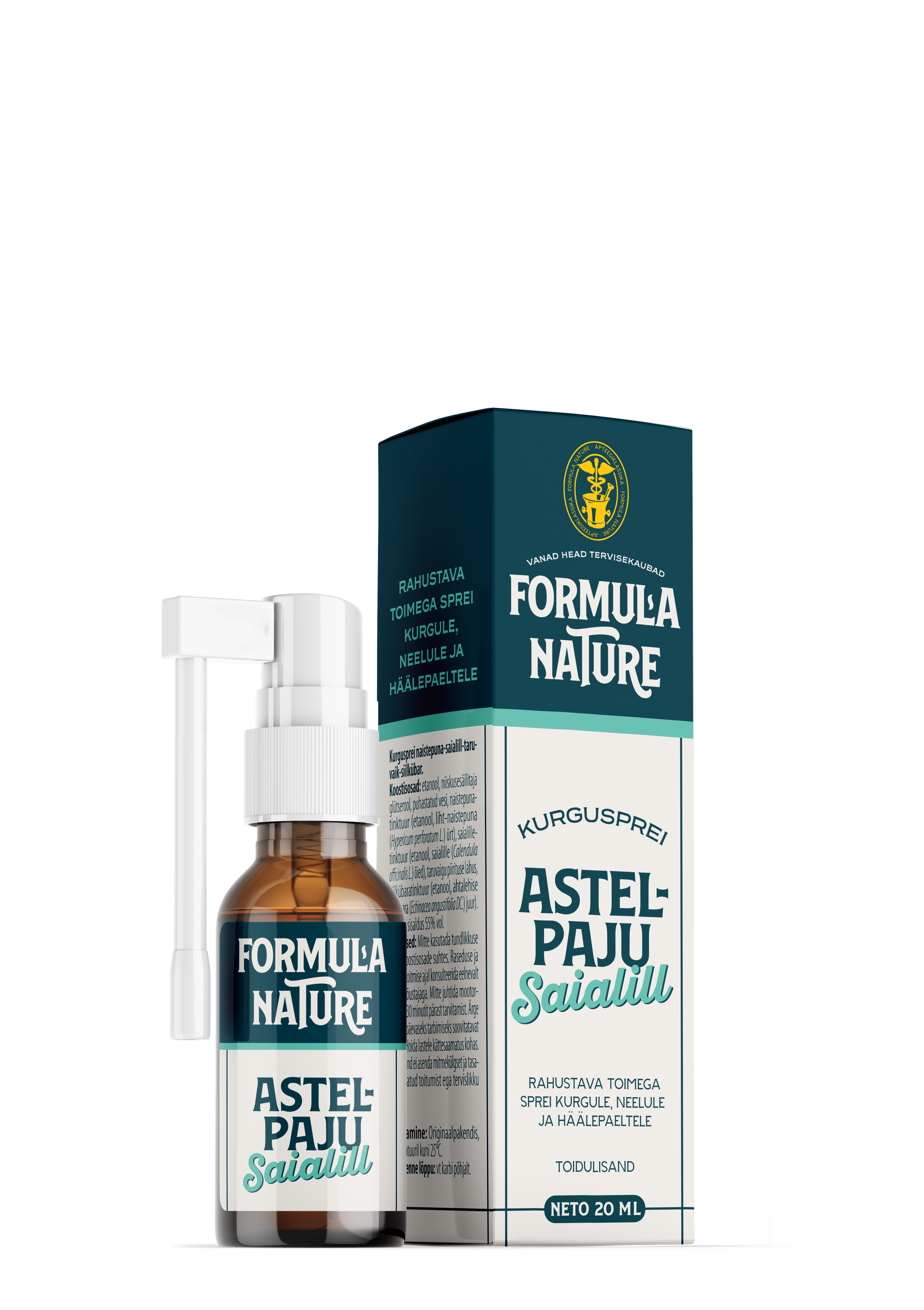 Tootetutvustus Toidulisand astelpaju ja saialillega. Saialillel on rahustav toime kurgule, neelule ja häälepaeltele. Päevaseks tarbimiseks soovitatav kogus ning tarvitamisjuhised Täiskasvanutel 3 pihustust korraga otse kurku 3 korda päevas. Enne kasutamist loksutada pudelit. Sisaldus päevase annuse kohta Päevane annus 9 pihustust sisaldab: Astelpajuõli 86,4 mg Saialilleõli 54 mg Koostisosade loetelu (allergiat või talumatust põhjustav koostisosa või abiaine märgitud TRÜKITÄHTEDES) Oliiviõli (har...