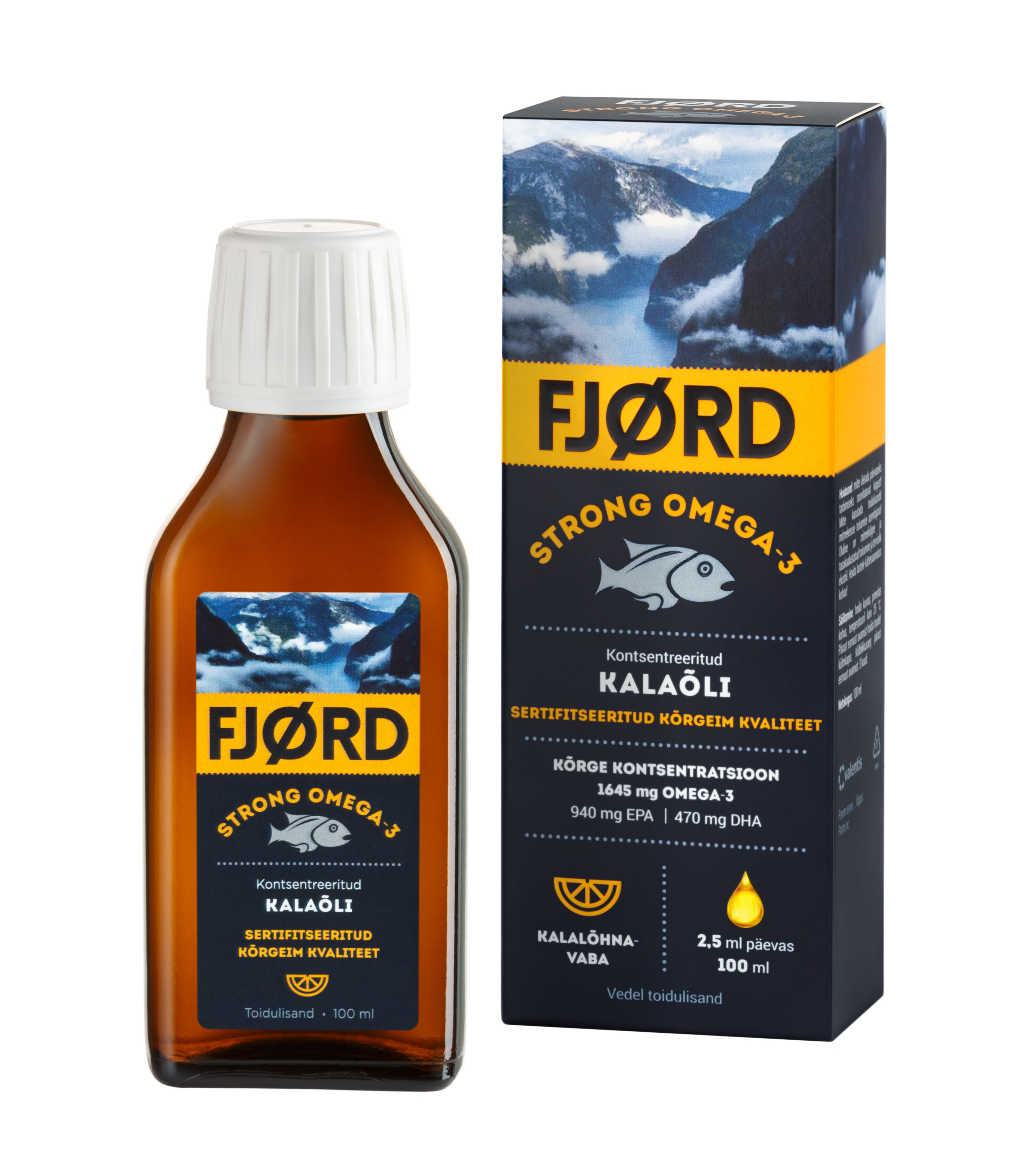 Tootetutvustus FJØRD STRONG OMEGA-3 kalaõli (100 ml.) Toidulisand kogu kehale, südamele, vererõhule, triglütseriididele, ajutegevusele, nägemisele, immuunsusele. + Eriti kõrge oomega-3 rasvhapete kontsentratsioon, mis on saadud väikestest rasvastest looduslikest kaladest. + Sertifitseeritud kõrgeima kvaliteediga tooraine. Vastavalt IFOS-i (International Fish Oil Standards) Consumer Report'ile vastab FJORD kalaõli tooraine kõige kõrgematele 5-tärni hindamiskriteeriumidele. + Hästi imenduv. Taases...