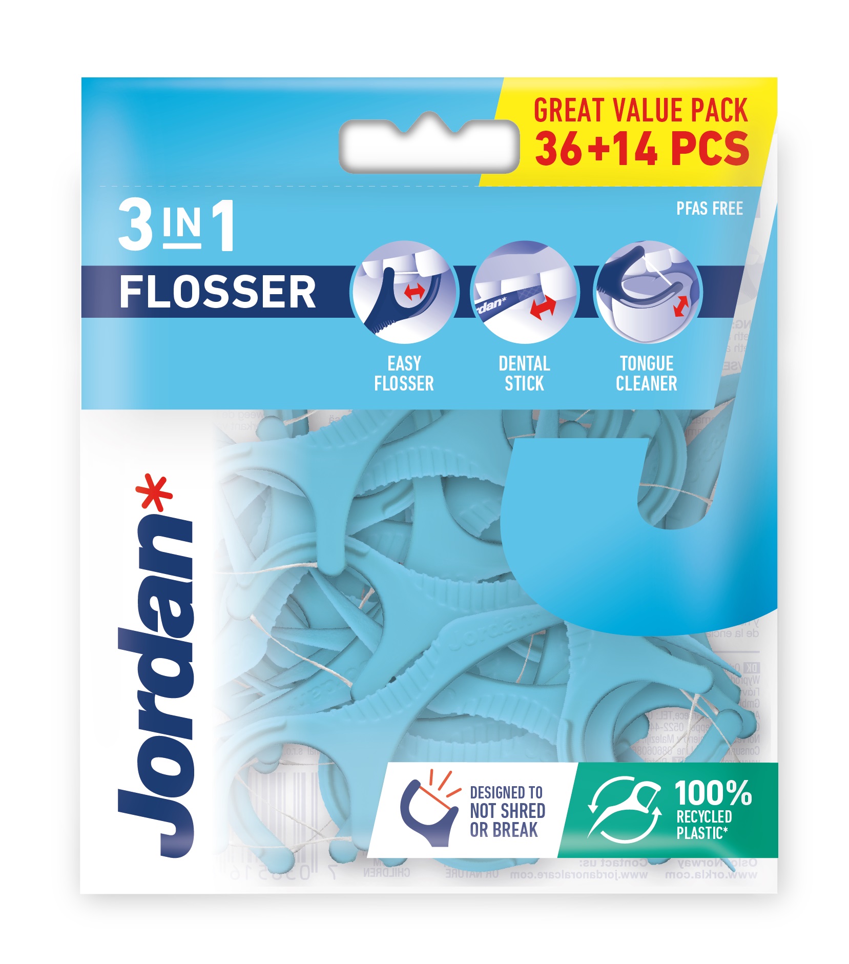 Kolme funktsiooni ühendav toode on kiire elutempo juures tõhus abiline: Hambaniit eemaldab hammaste vahelt katu; hambatikk eemaldab hammaste vahelt toidu osakesed ja stimuleerib igemeid; keelepuhasti aitab eemaldada keelelt bakterid tagades värske hingeõhu. Jordan 3-in-1 Flosser on praktilises taassuletavas kotis - ideaalne kaasas kandmiseks ja kasutamiseks, mil iganes Sa seda vajad! Kasutamisjuhised Hambavahepuhasti 3-in-1 Hambaniit: Liigutage niiti hambavahes üles-alla...