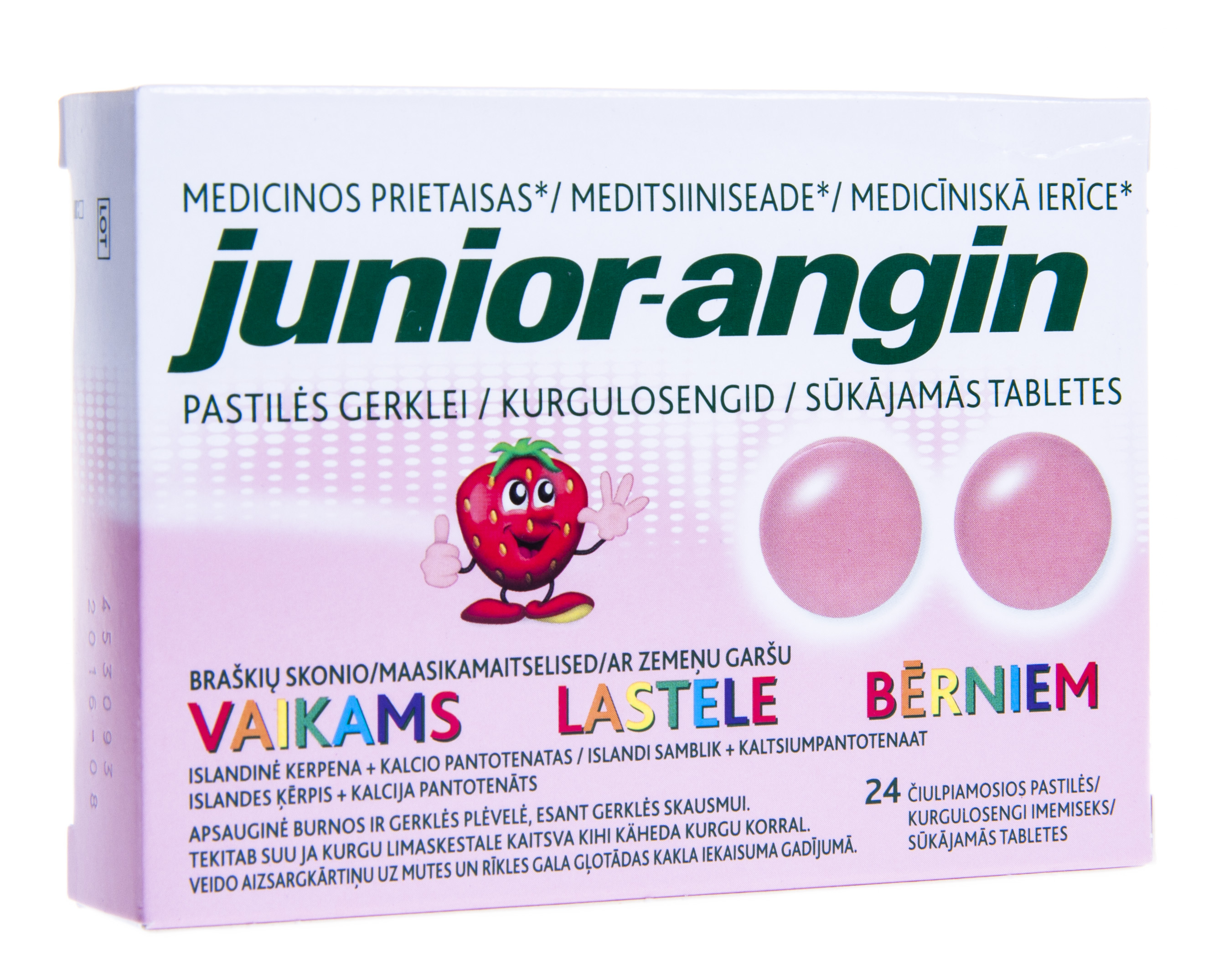 Junior-angin kurgulosengid on meeldiva maasika maitsega meditsiiniseade, mis kaitseb suu ja kurgu limaskesta, eriti käheda kurgu korral. Losengi imemisel moodustab islandi samblik suu ja kurgu limaskestale kaitsva kihi. Losengi imemine tagab toimeainete ühtlase jaotumise suu ja kurgu limaskestal. Kasutamisjuhised Junior-angin kurgulosengid on mõeldud imemiseks. Täiskasvanud ja lapsed alates 4. eluaastast peaksid vajadusel laskma suus sulada ühe junior-angin kurgulosengi ...
