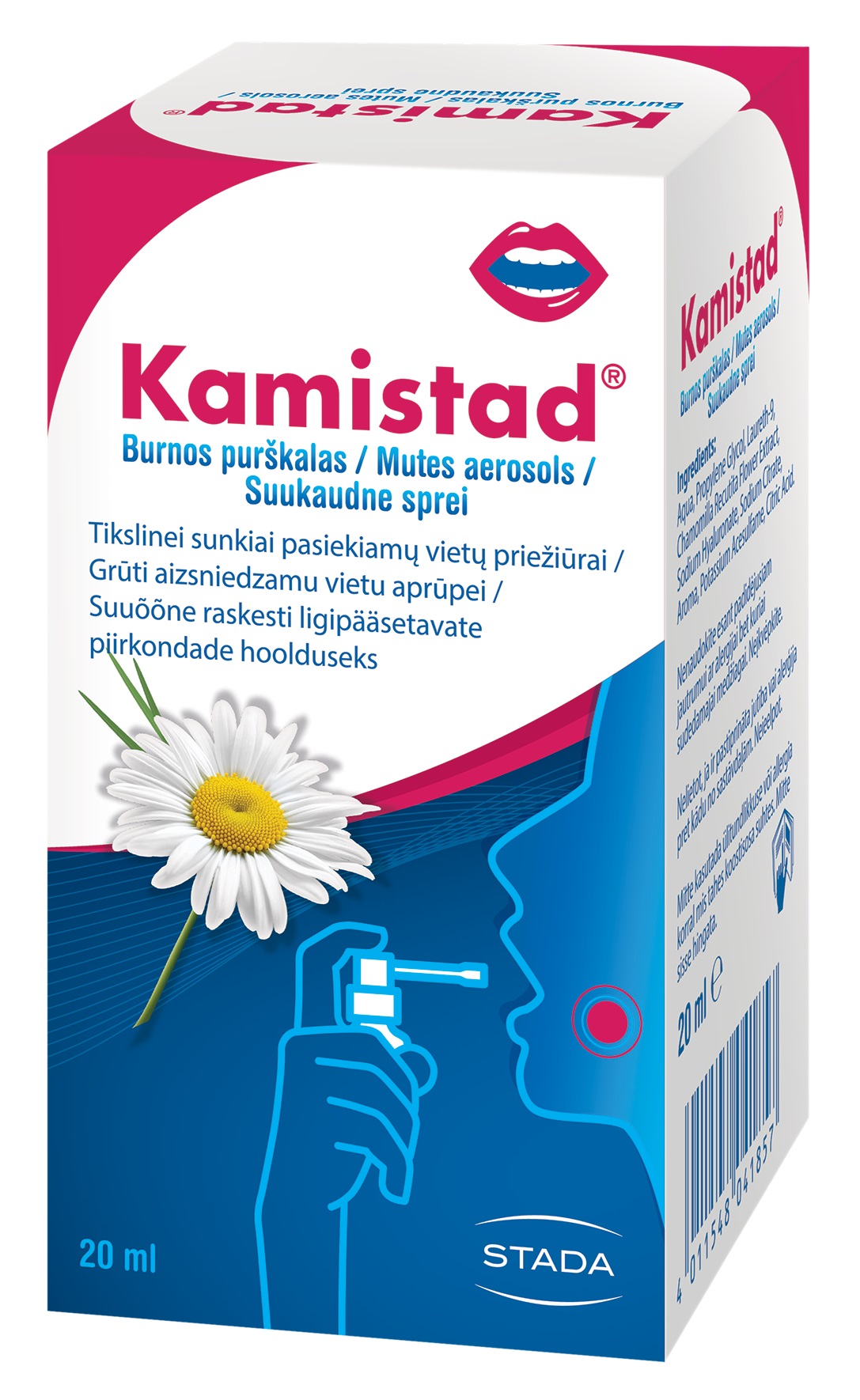 Kummelit sisaldav Kamistad® suukaudne sprei on mõeldud suu limaskesta ja igemete õrnaks hoolduseks. Pööratav otsik võimaldab pihustada suu limaskestale ja suuõõne raskesti ligipääsetavatesse kohtadesse. Suhkruvaba Alkoholivaba Kasutamisjuhised 1. Suunake pööratav pihustusotsik suuõõne soovitud piirkonnale 2. Pihustage 1 kuni 2 pihustust igal hommikul ja õhtul pärast hammaste pesemist või kasutage vastavalt vajadusele. Koostisosade loetelu (Ingredients) vesi, propüleenglü...